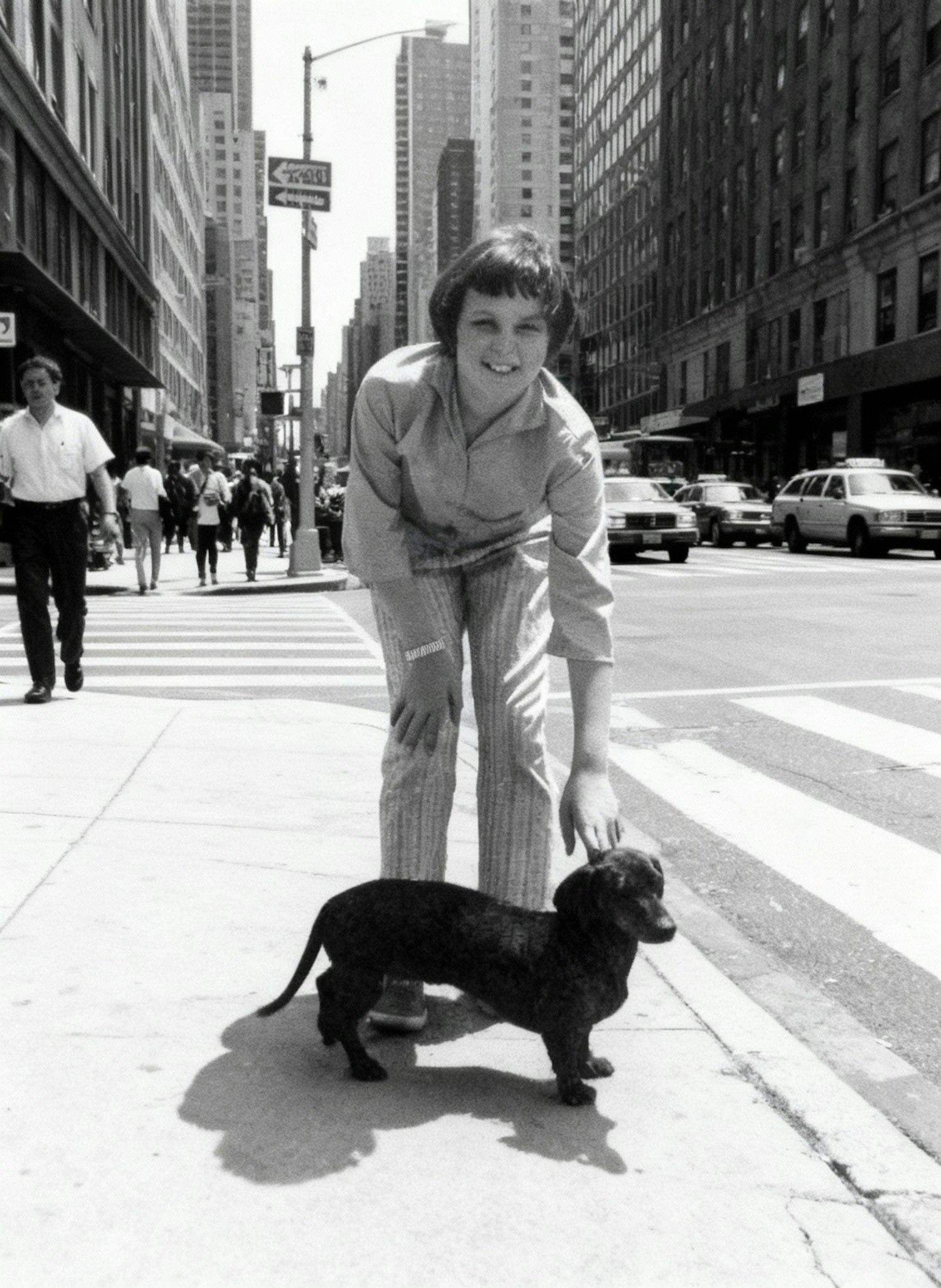 A black-and-white photo of a person petting a small dog on a busy city sidewalk, surrounded by tall buildings and urban life.