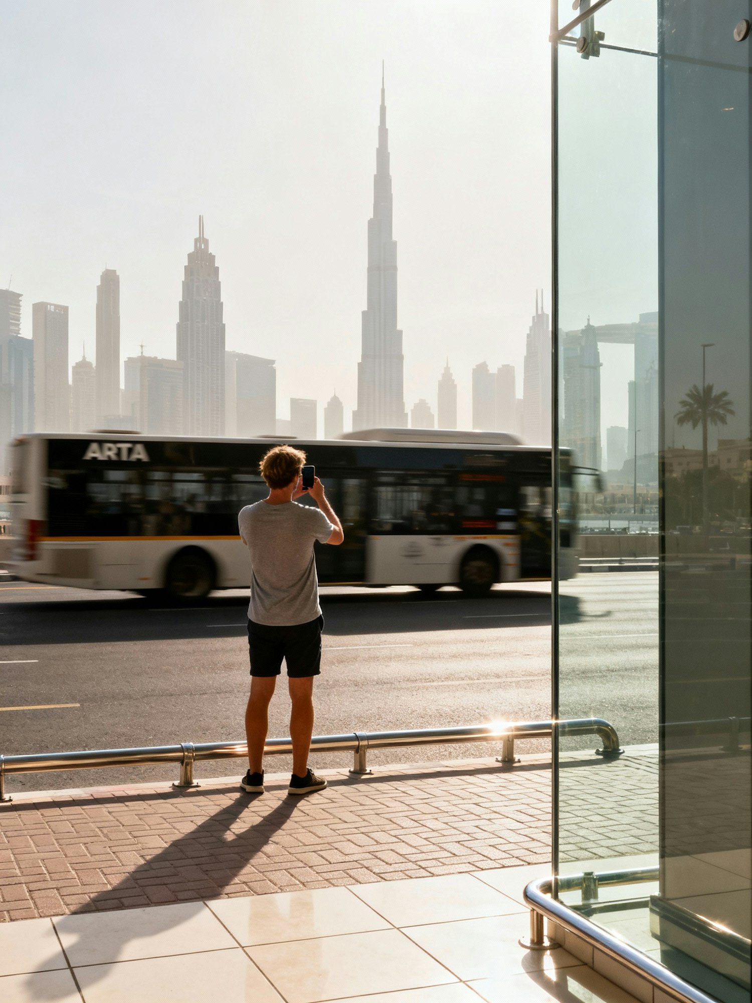 Bright late-morning on a boulevard with Dubai towers in soft haze; tourist standing at edge of pavement facing the skyline, holding phone up to shoot, RTA bus in background softly blurred; sun bouncing off light tiles and guardrail. 35 mm, 1/800 s, f/4, ISO 100, WB 5200 K; front-lit with gentle side fill from nearby glass façade. Negative: brand/hotel logos, overpolarized sky, HDR look.