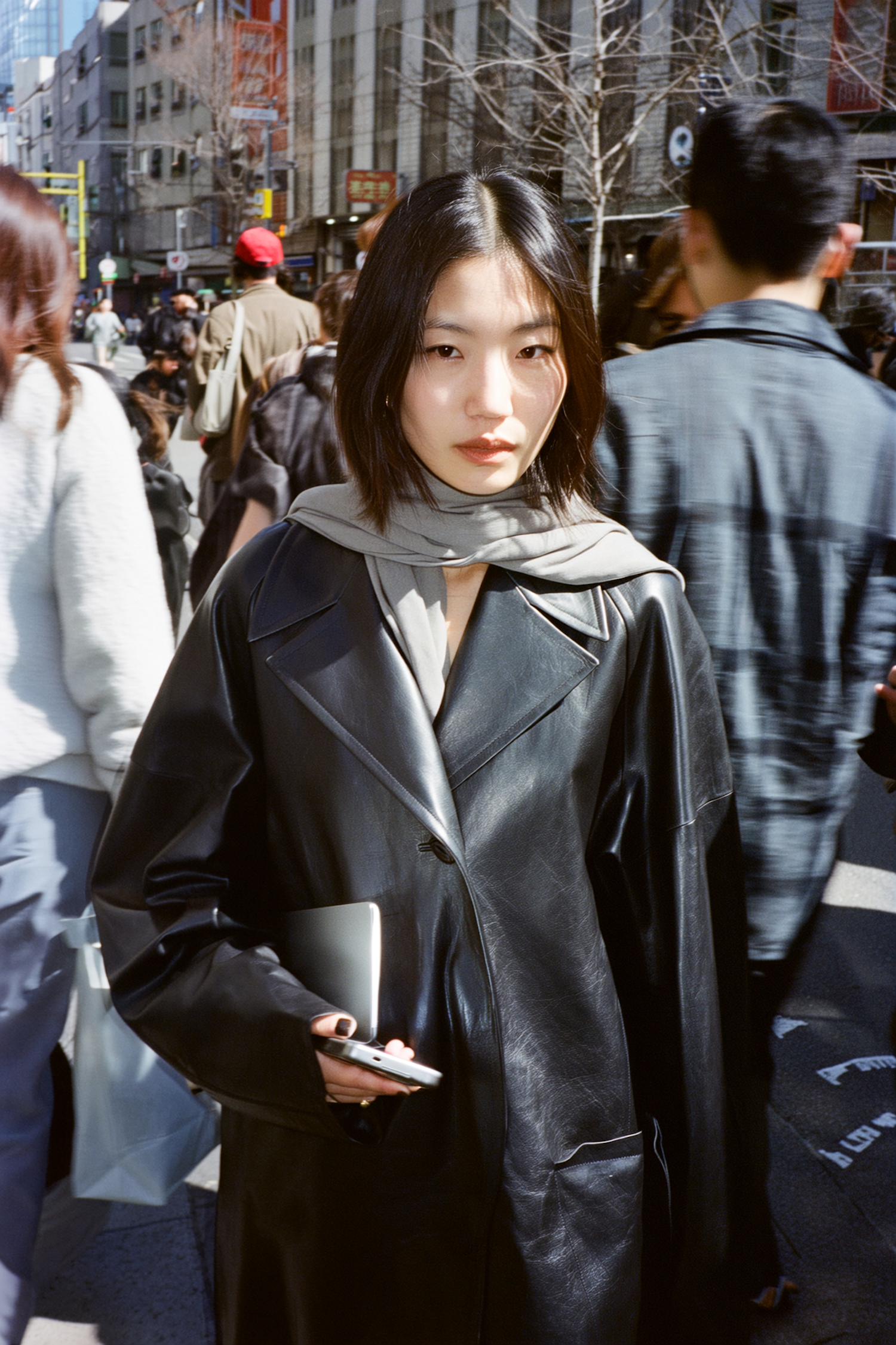 Stylish woman in a black leather coat and gray scarf amidst a bustling urban street, holding a smartphone and notebook.
