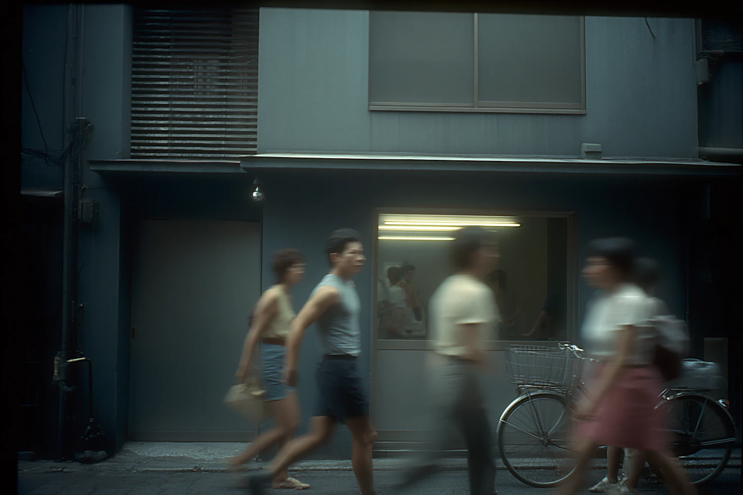 A blurred street scene with people walking past a blue building, a parked bicycle, and a window glowing with fluorescent light.