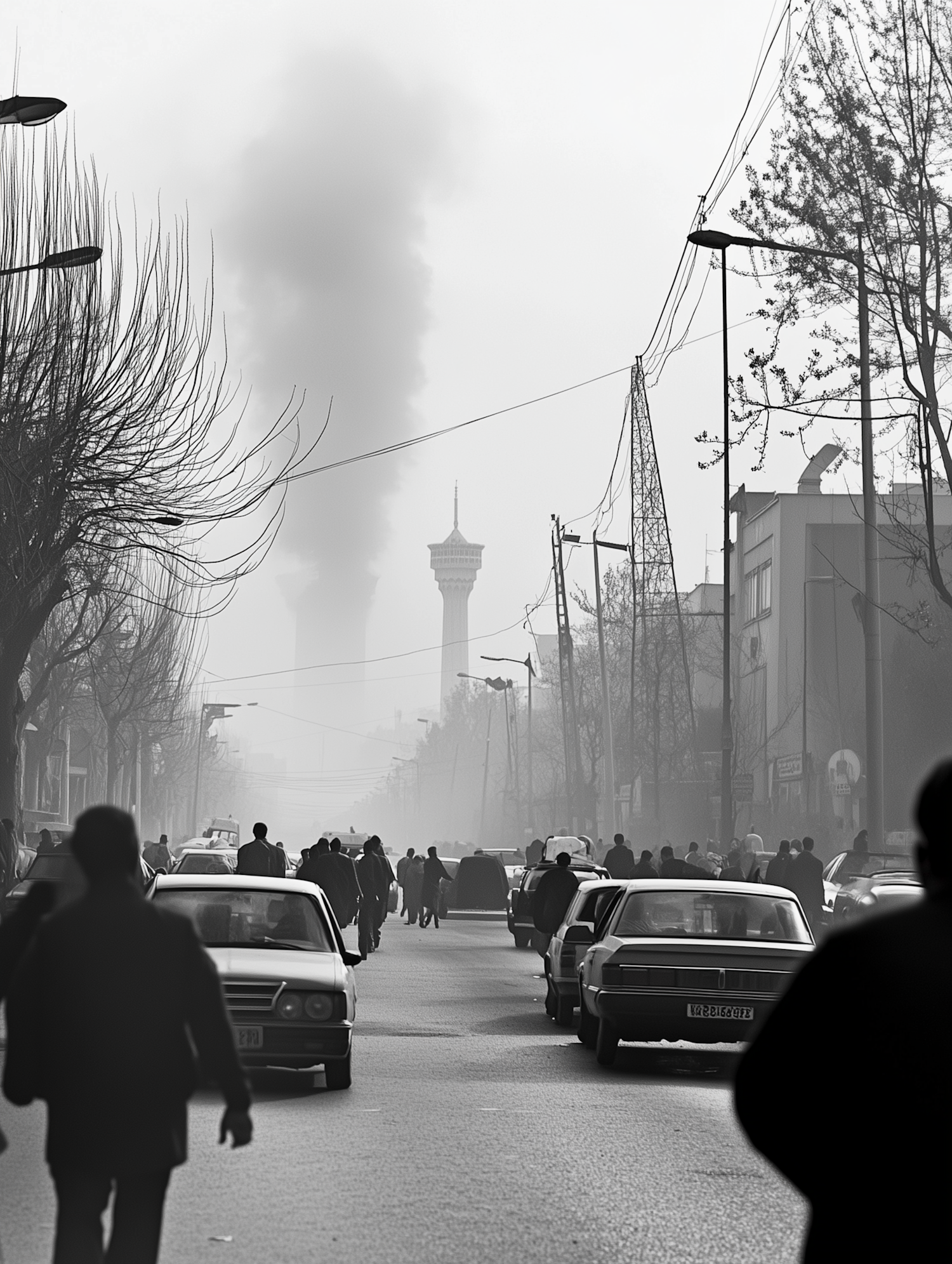 A hazy urban street with cars, pedestrians, and a tall tower in the background, partially obscured by smoke or mist.