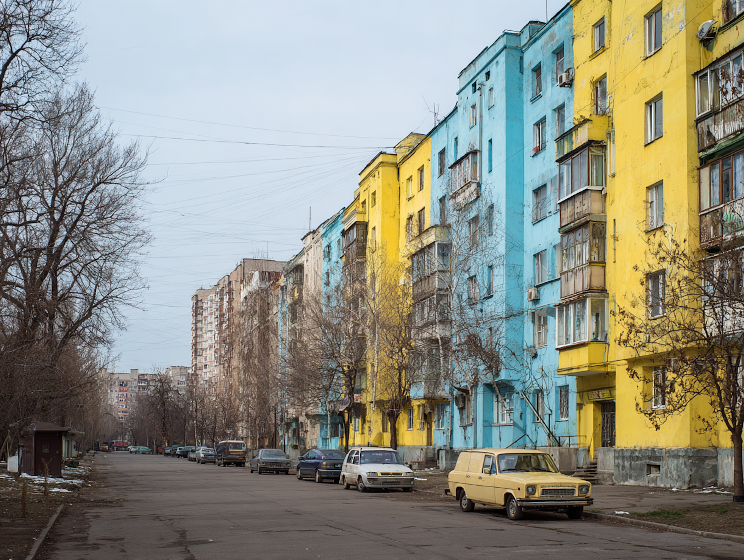 Urban street with colorful apartment blocks, parked cars including a vintage yellow one, and sparse leafless trees under a gray sky.
