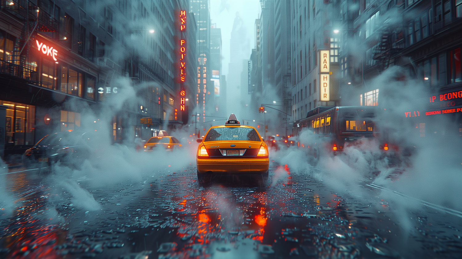 Vibrant city street with yellow taxi, neon signs, and steam rising from wet pavement, creating a dynamic urban atmosphere.