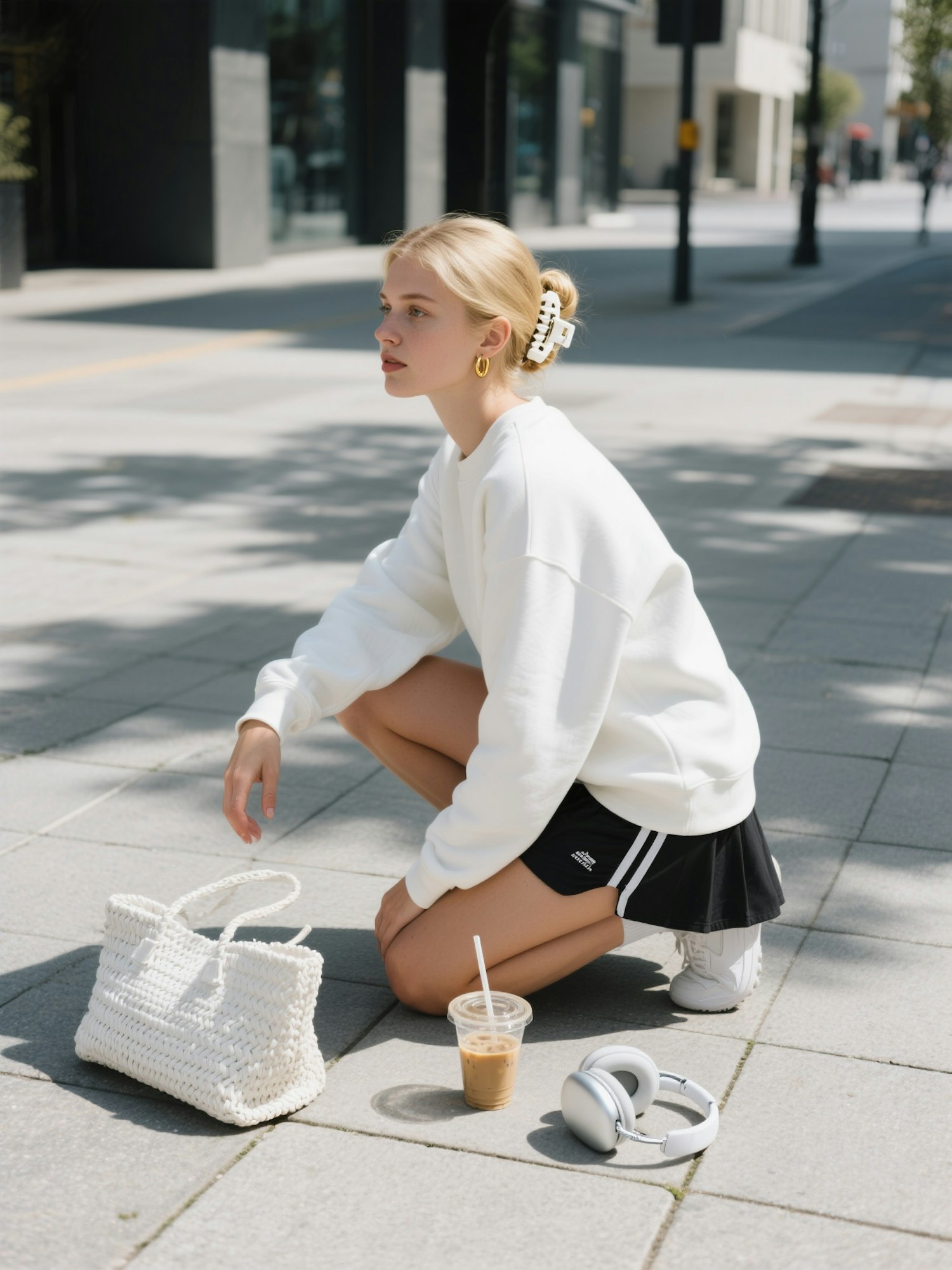 Street-style photograph of a young blonde woman crouching on a sunlit city sidewalk. She is wearing a plain white crewneck sweatshirt with long sleeves, minimalist design, no text, no logo. The sweatshirt has a casual, slightly loose fit in soft fabric. She is also wearing a short black tennis skirt, creating a sporty yet stylish look. Her hair is tied back in a neat bun secured with a large white claw clip, and she wears small gold hoop earrings. On the ground next to her are a white woven handbag, a plastic cup filled with iced coffee, and a pair of white headphones. The pavement is light grey stone with clean geometric lines, partially covered with soft tree shadows. Bright natural daylight, realistic photography, modern lifestyle aesthetic