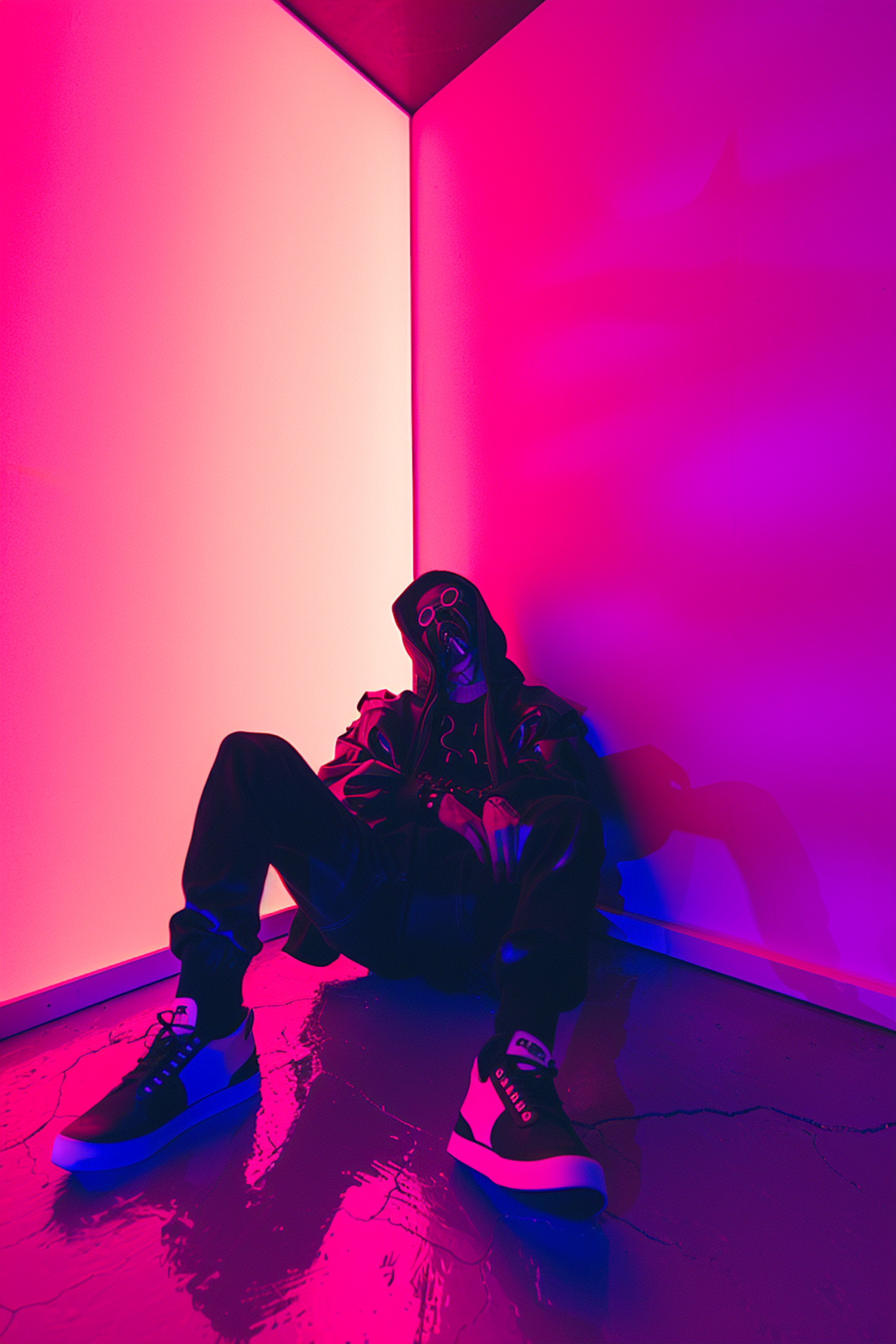 Person in dark clothing sits in neon-lit room with pink and purple hues, creating a moody, futuristic atmosphere.