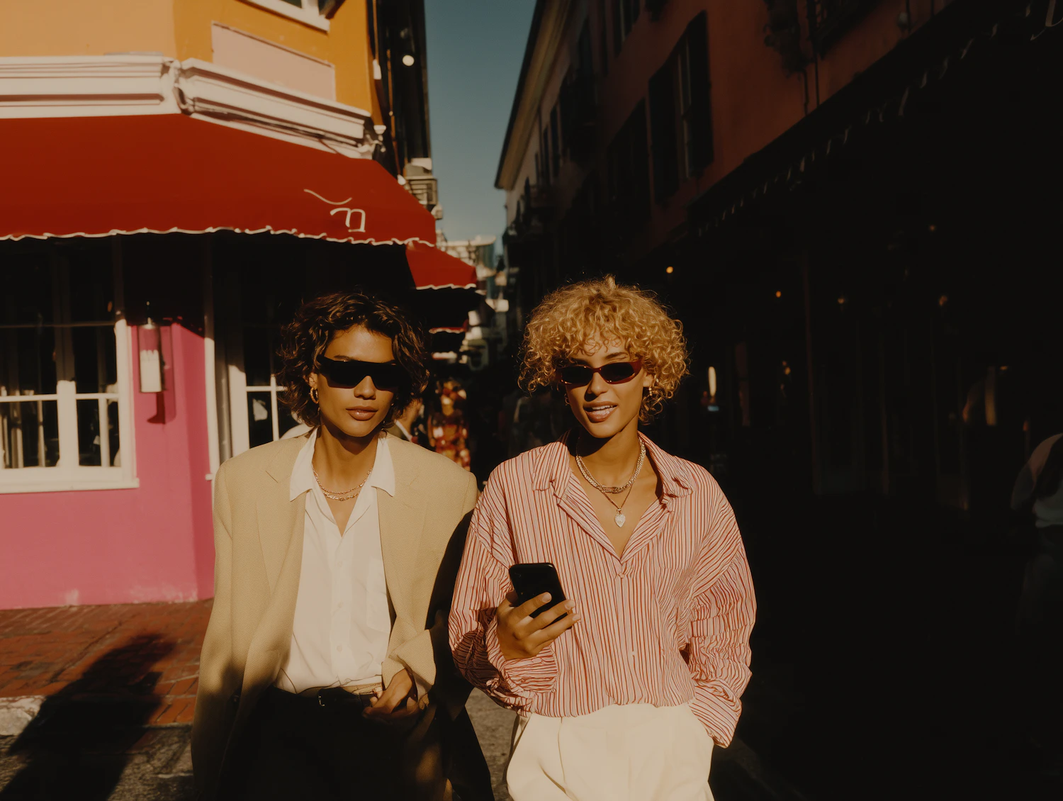 Two stylish individuals walk together in a vibrant urban setting, wearing sunglasses and engaging in conversation.