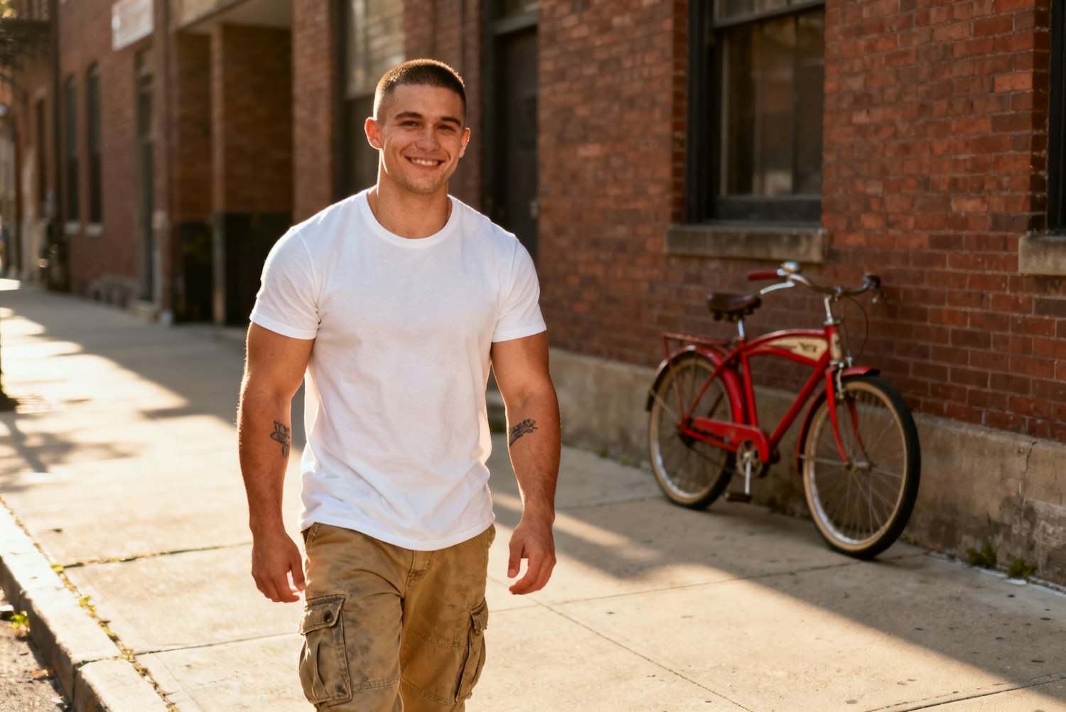 A photograph of a young man with a close-cropped haircut and a confident smirk, standing against a backdrop of a modern urban street. He has a muscular, stocky build and is dressed in well-worn khaki cargo pants and a simple white t-shirt, revealing subtle arm tattoos. Soft sunlight casts long shadows across the textured concrete sidewalk and highlights the details of the brick buildings lining the street. A lone, vintage red bicycle leans casually against one of the buildings, adding a touch of nostalgic charm to the scene.