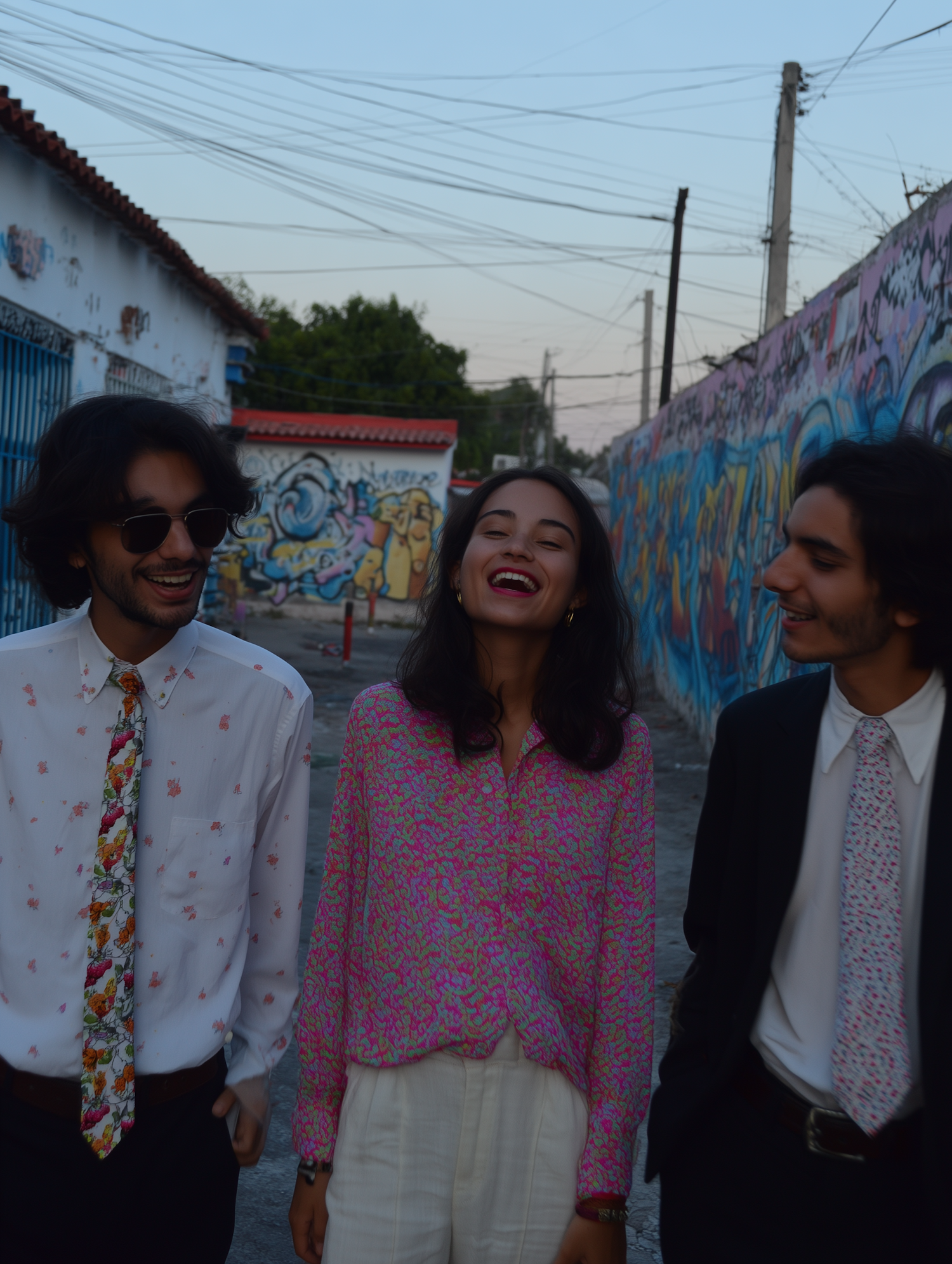 Three friends walking and laughing in a graffiti-decorated urban alley, dressed in colorful and stylish outfits.