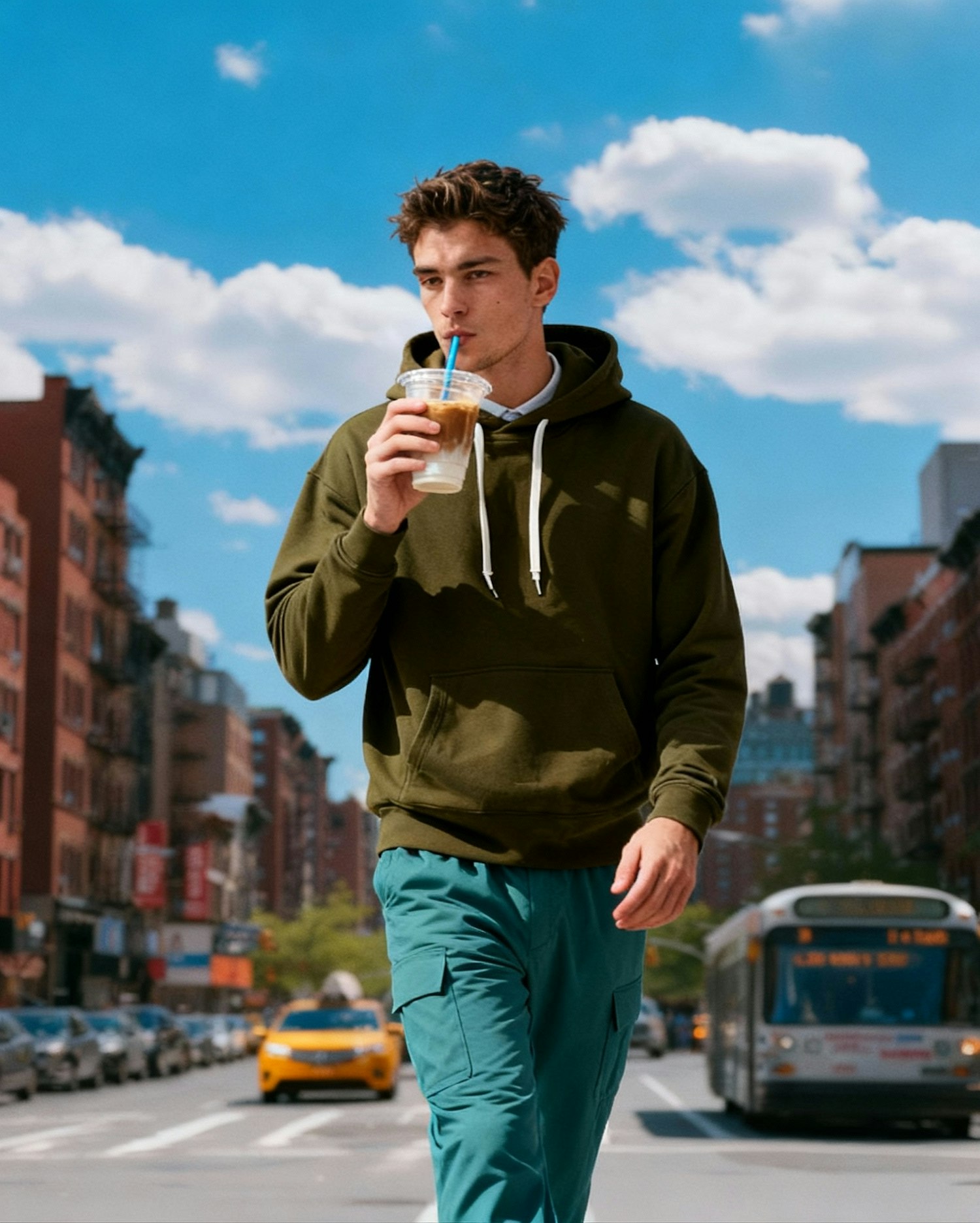 A young man in a green hoodie and teal pants walks in the city, sipping iced coffee. Urban background with a taxi, bus, and blue sky.