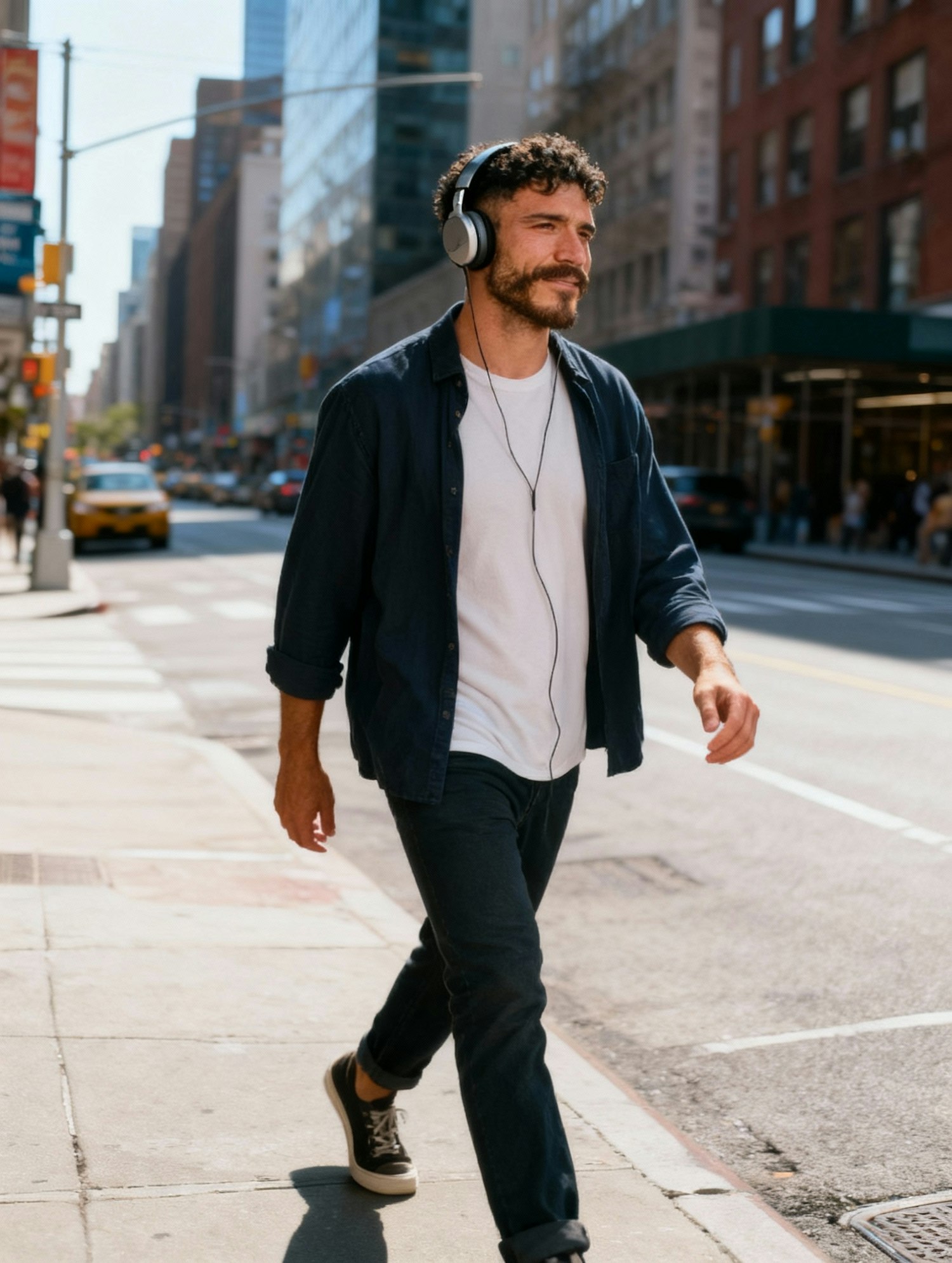A man walking in a city, wearing headphones and casual attire, enjoying a sunny day with urban buildings in the background.
