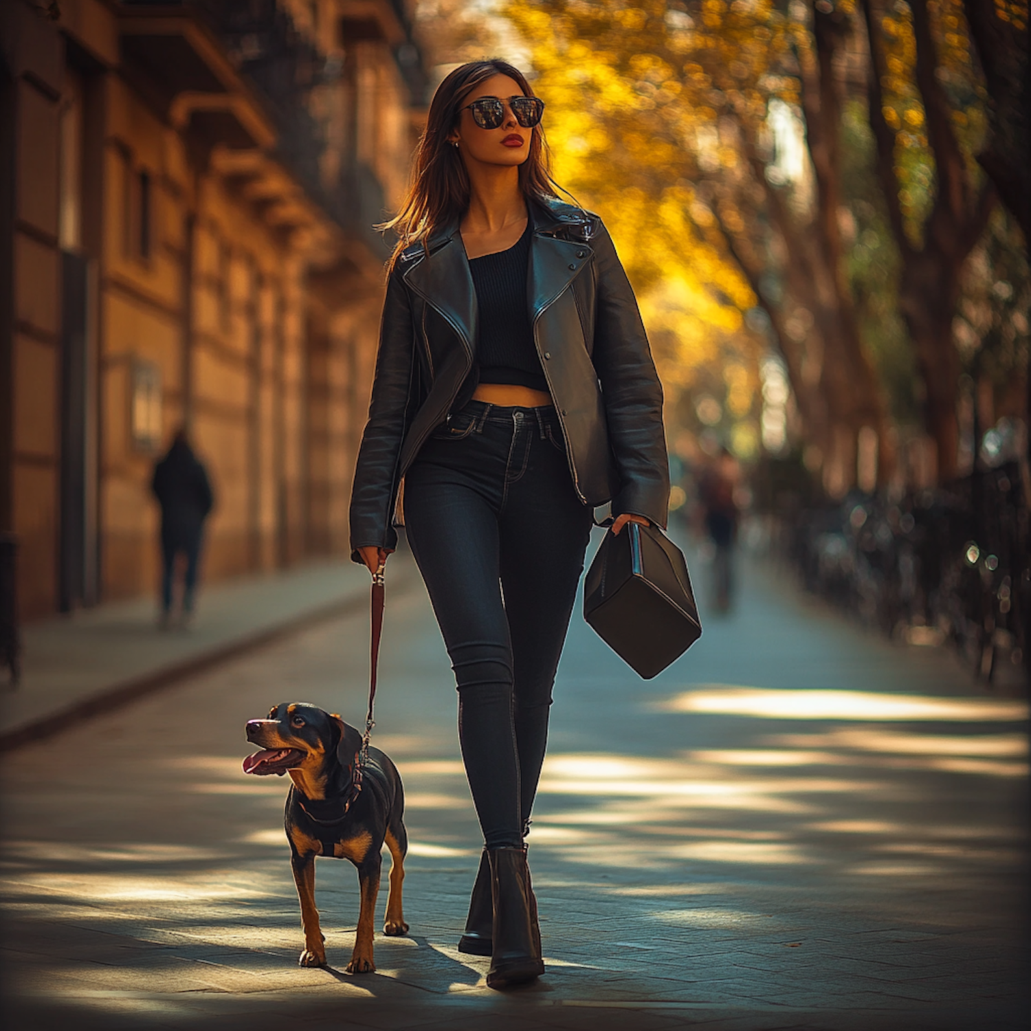 Stylish woman in black leather jacket walking her dog on a sunny autumn street, exuding confidence and elegance.