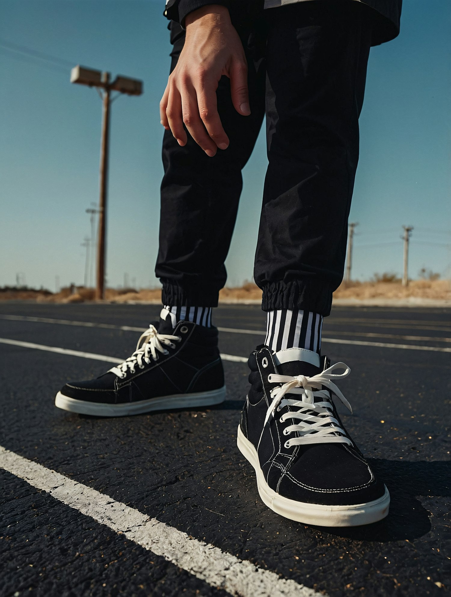 Stylish black high-top sneakers with white laces and striped socks on asphalt, under a clear blue sky.
