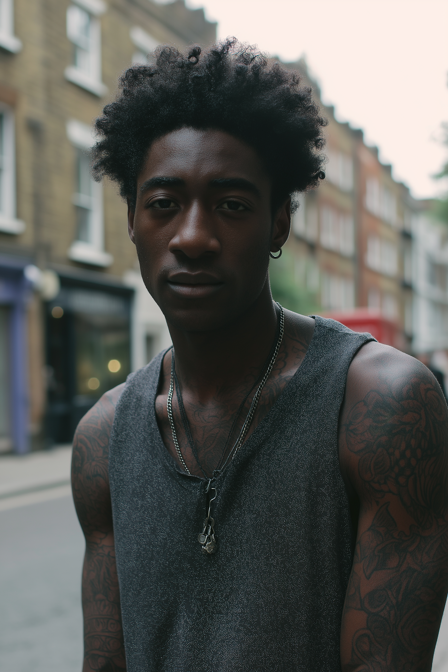 A stylish man with an urban background, showcasing tattoos and a distinctive necklace in a casually modern look.