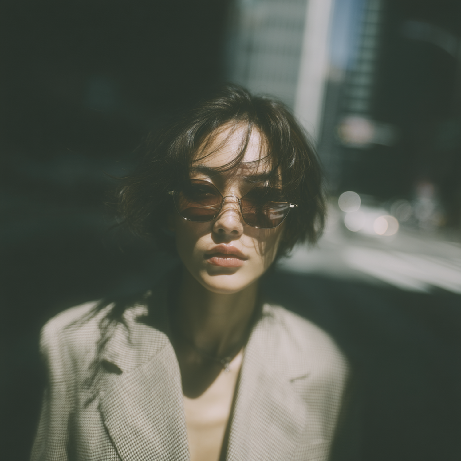 Stylish individual in sunglasses and a blazer, captured in a dramatic urban setting with cinematic lighting and blurred background.