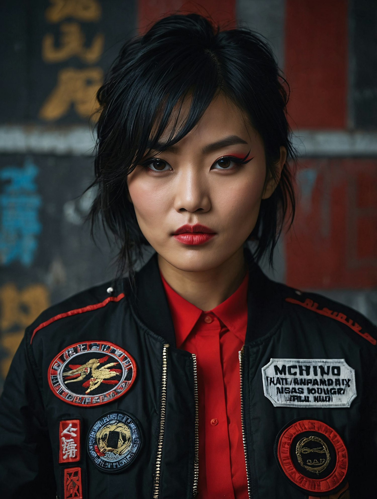 Confident Asian woman in a bold bomber jacket with patches, striking red makeup, and urban graffiti background.