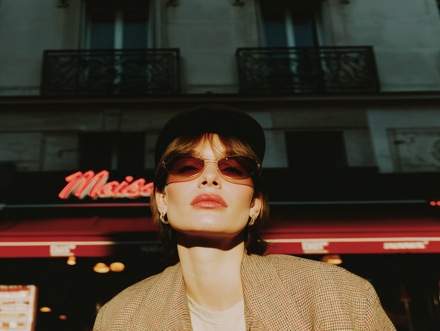 Stylish individual in sunglasses and cap, set against a vibrant urban backdrop with neon signage and warm lighting.