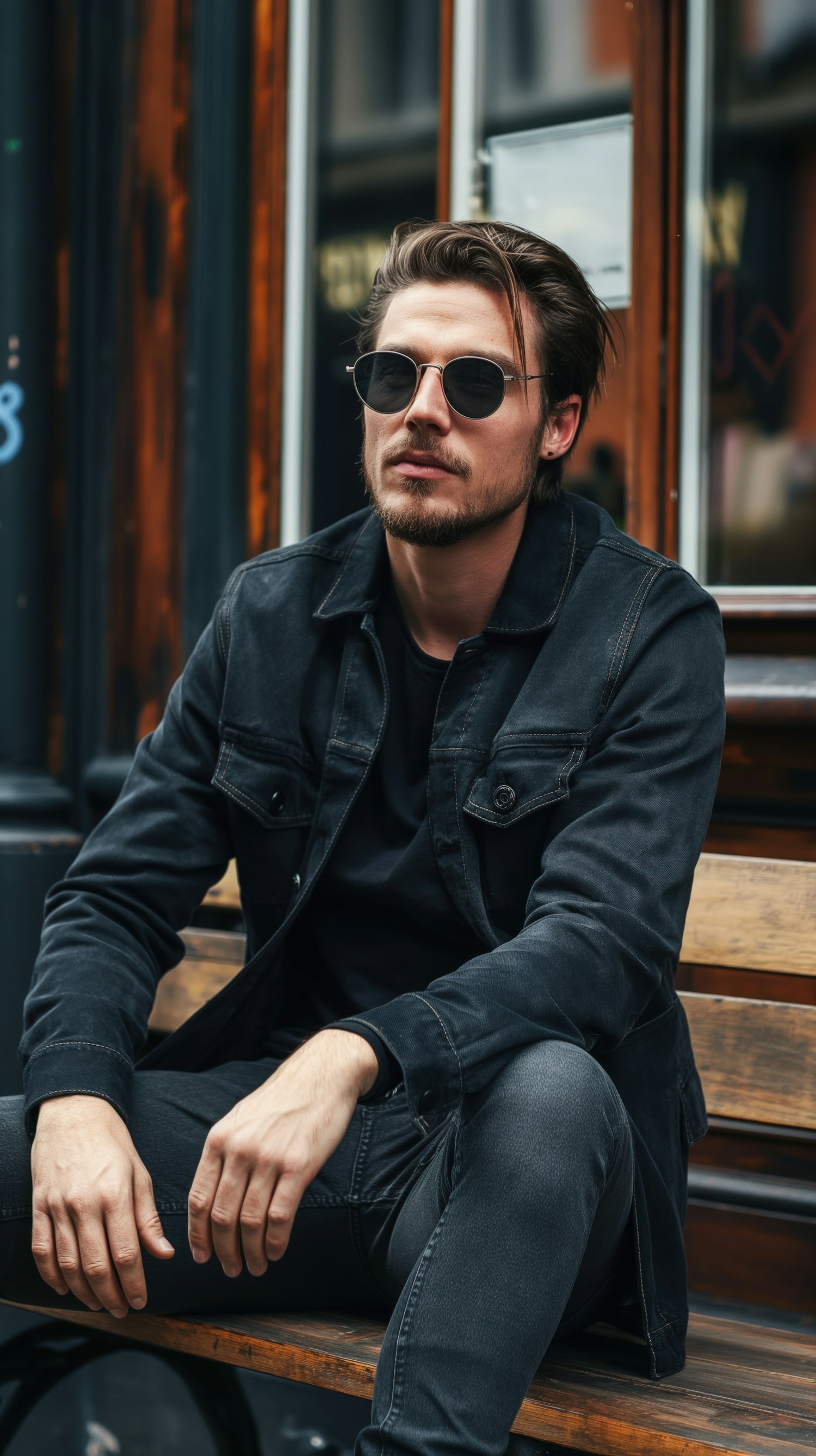 Stylish man in black denim jacket and sunglasses sitting on a bench in an urban setting, exuding confidence and casual elegance.