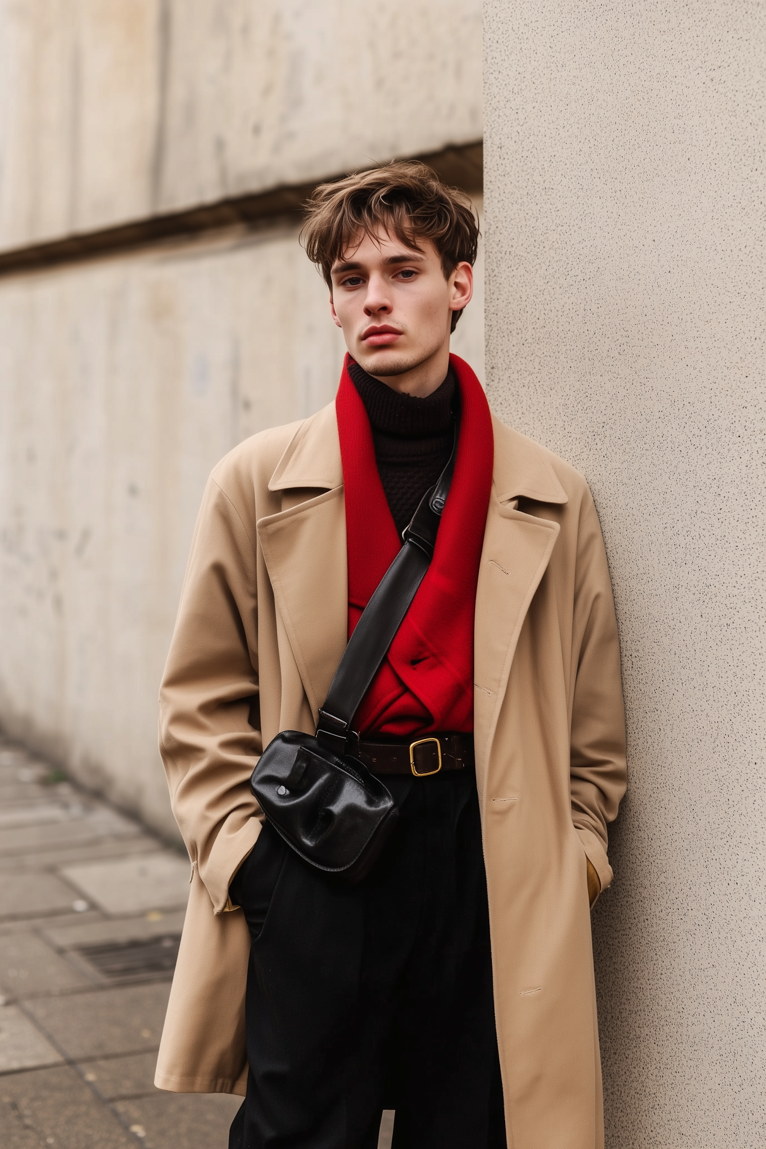 Stylish individual in beige trench coat, red sweater, and black trousers with a crossbody bag, standing against a textured wall.