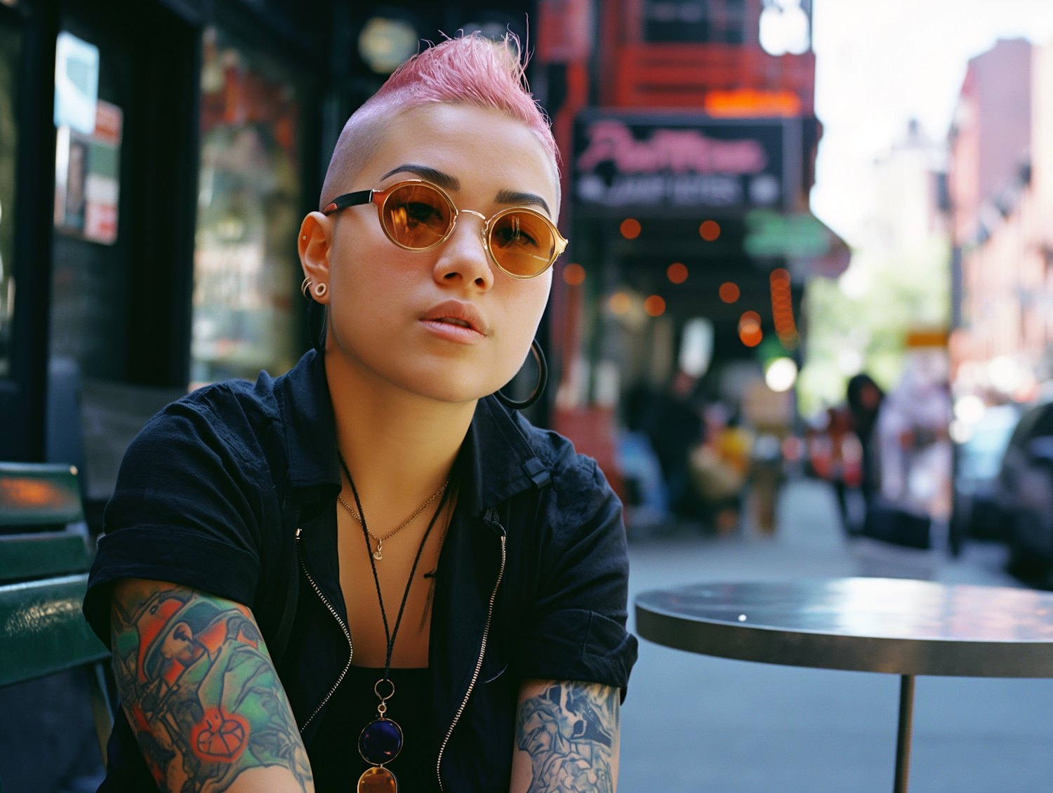 Stylish woman with pink hair and tattoos sits at an outdoor cafe, wearing sunglasses and layered necklaces in a vibrant city setting.