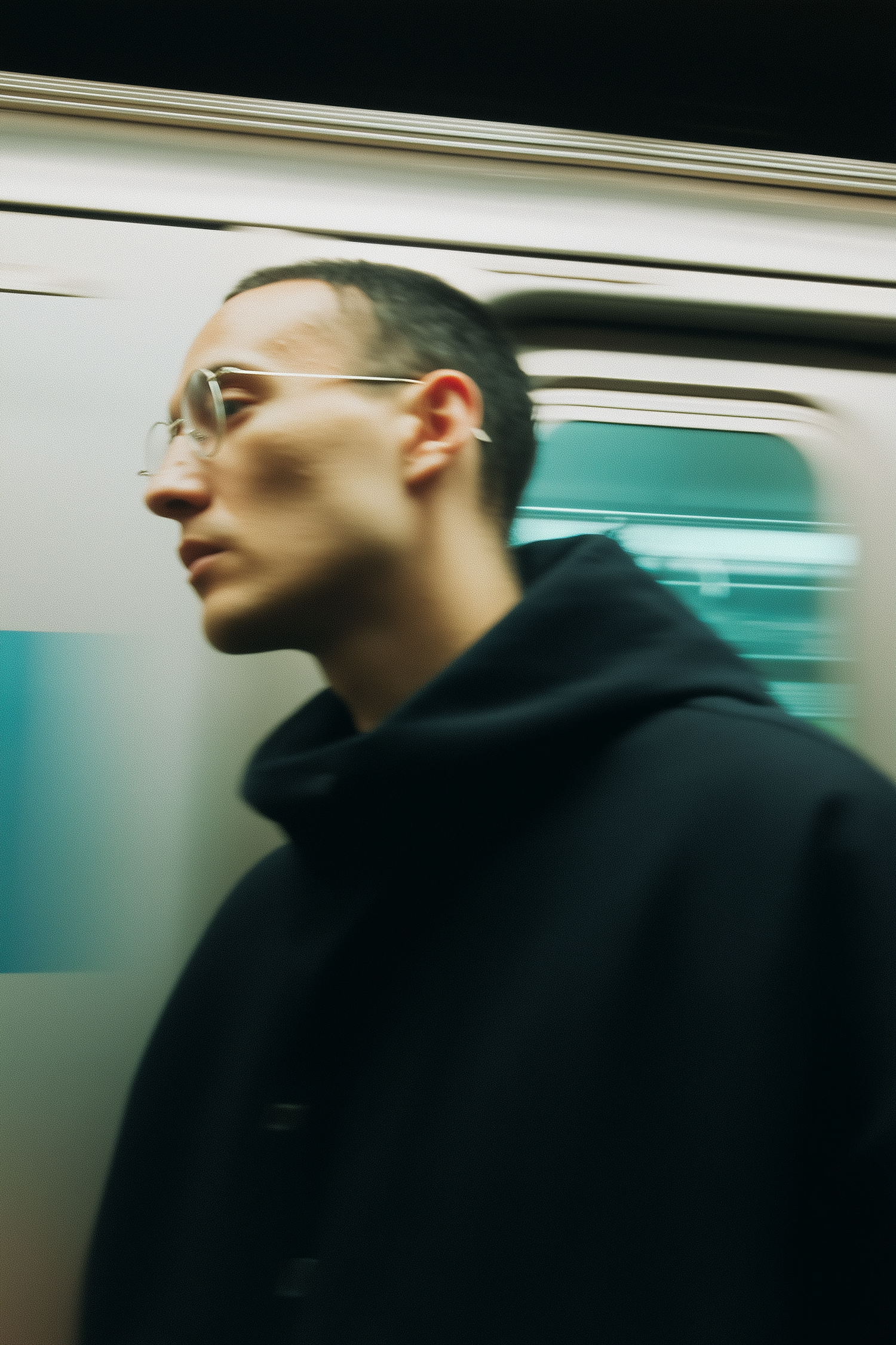 Blurred motion shot of a person in glasses and a dark coat near a moving subway train, capturing an urban and dynamic vibe.