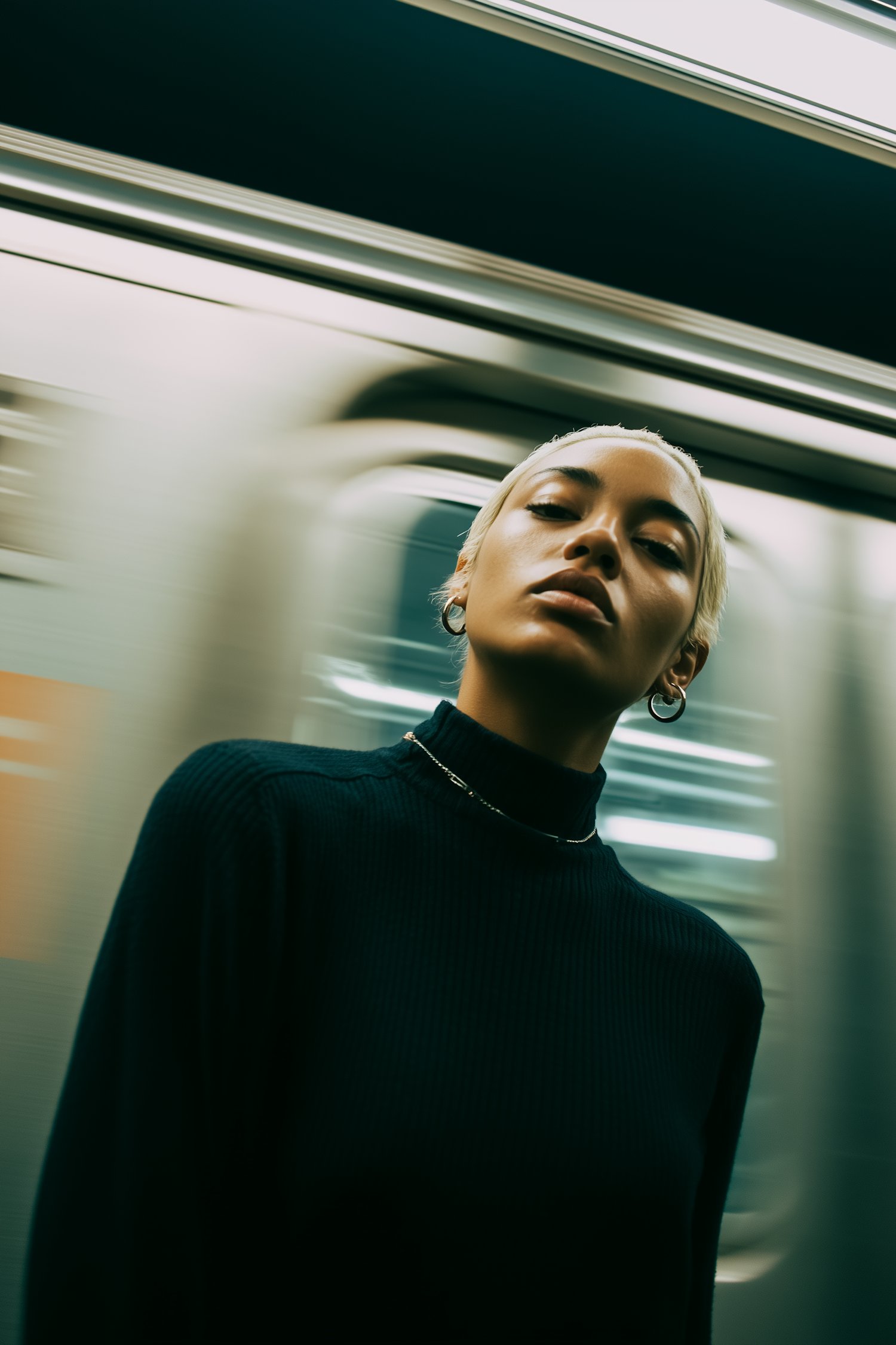Stylish individual in a subway station, wearing a dark turtleneck and hoop earrings, with a blurred train in the background.