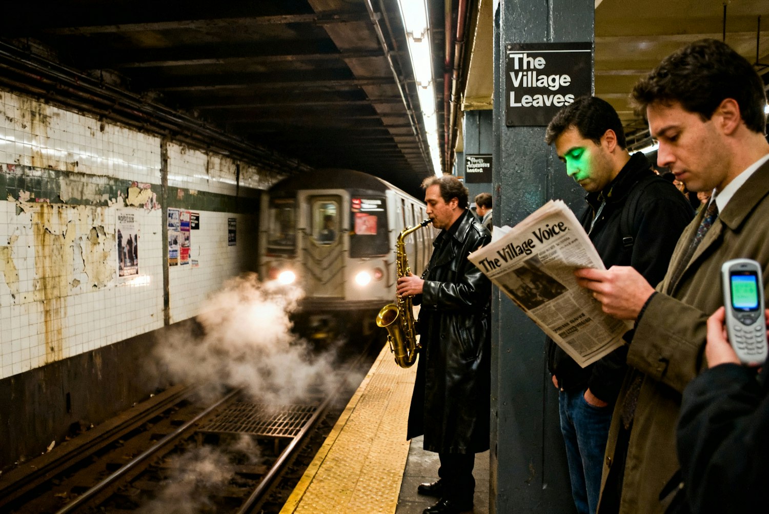 A realistic 2000s-era snapshot captured from platform level, 14th Street–Union Square, New York, March 2001, evening rush. Steam rises from a service grate as a train brakes, brake dust and ozone thick in the air. A saxophonist in a leather trench plays “Autumn Leaves,” the notes bouncing off tiled walls smeared with old posters. A line of commuters waits by the column, each in their own small world — one man reading The Village Voice, another thumbing a Nokia 3310, the screen’s green glow soft against his face. Taken with a Nikon Coolpix 995, ISO 400, f/3.5, 1/40s, automatic white balance. The edges show mild motion blur; tungsten lighting adds a sodium tint to the whites. A moment pulsing with the shared patience of strangers.