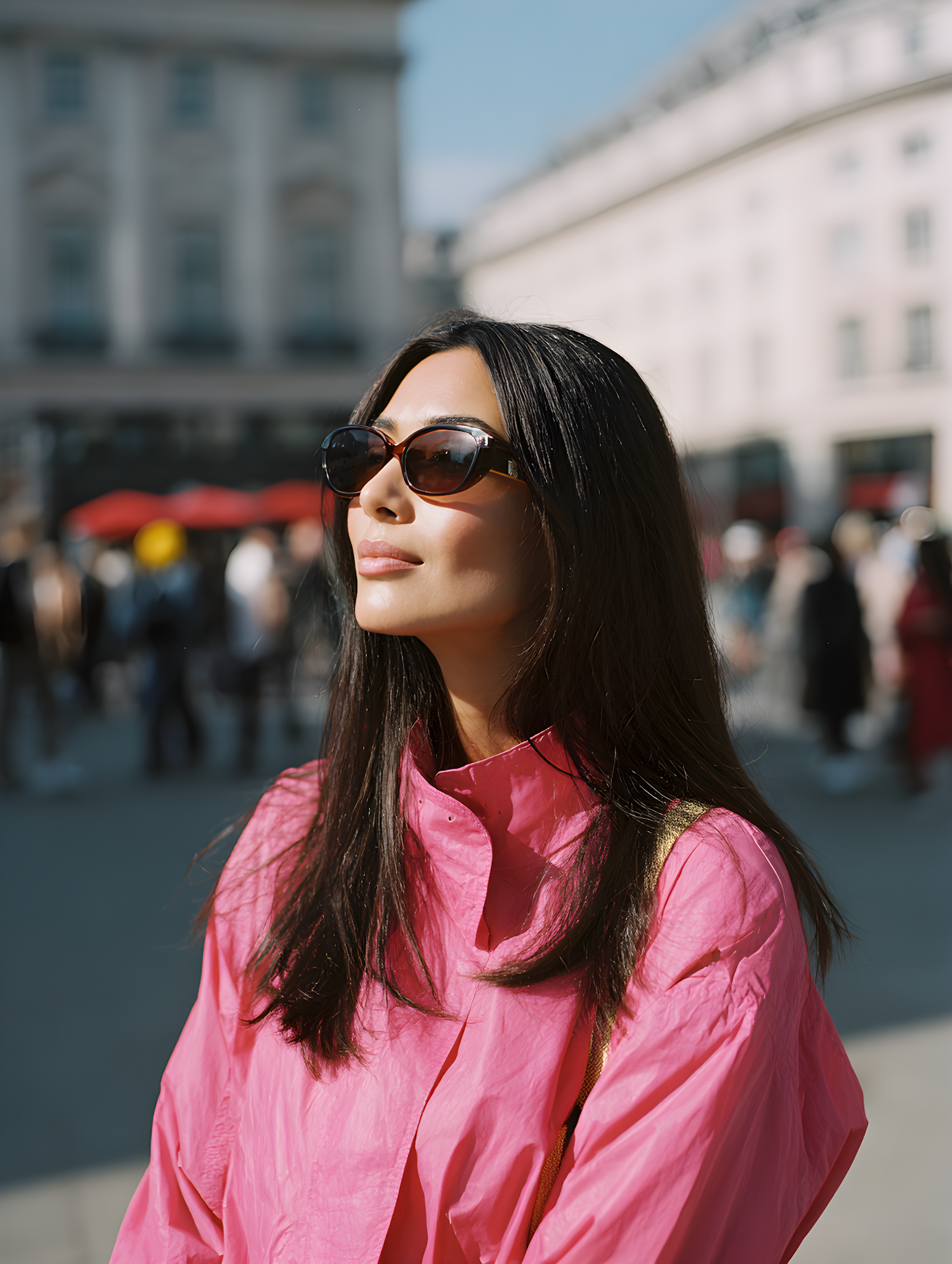 A stylish woman in a pink blouse and sunglasses enjoys a sunny day in a bustling urban setting.