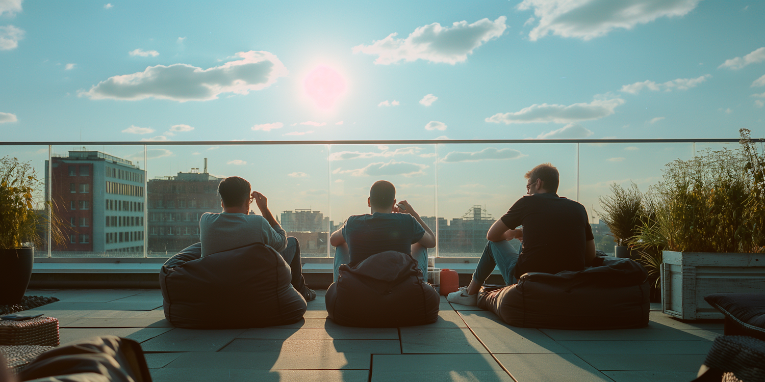 Three men relax on a rooftop terrace with bean bags, enjoying a sunny city view. Urban skyline and greenery create a serene atmosphere.