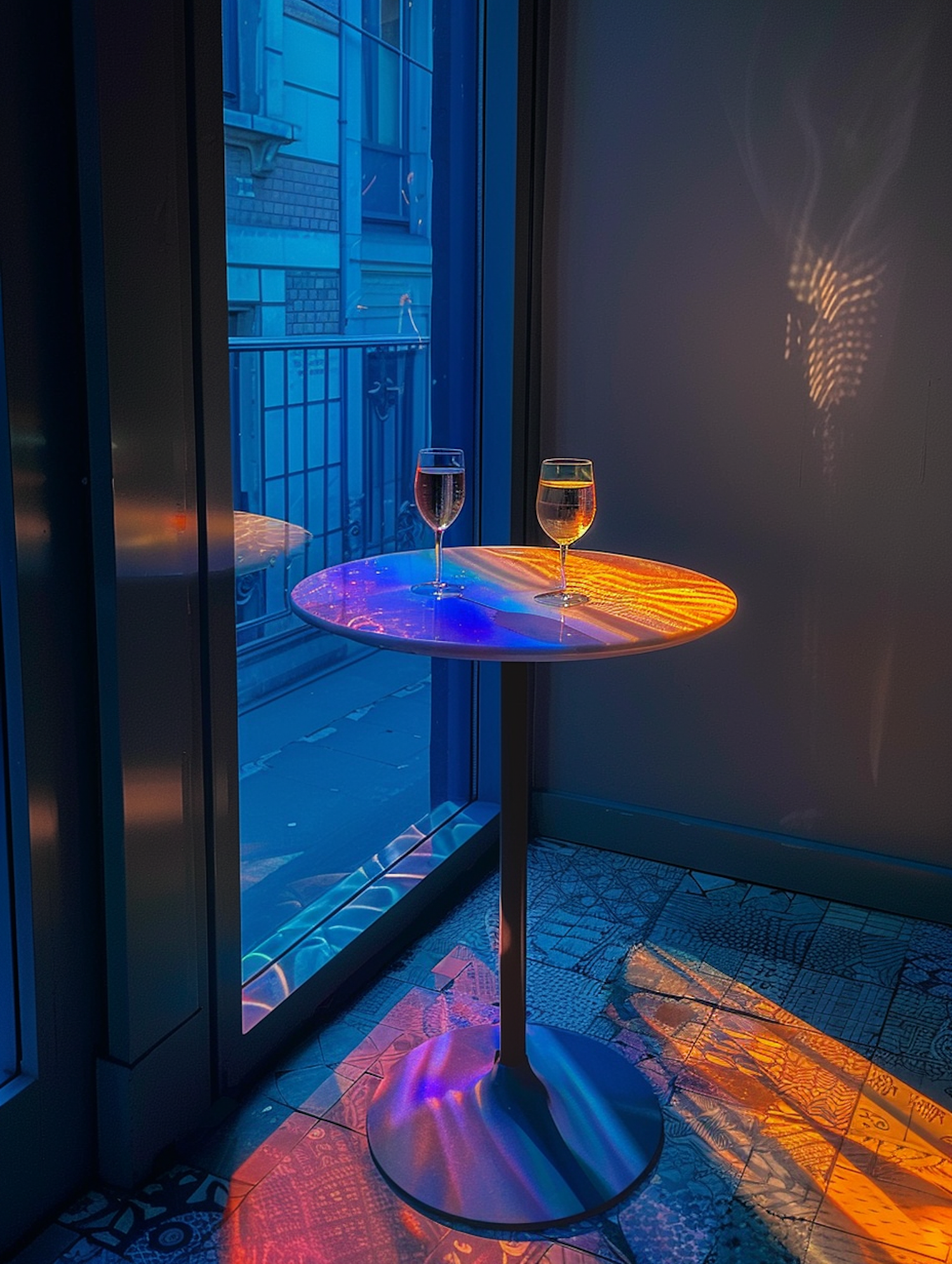 A round table with two wine glasses near a window, illuminated by vibrant orange, blue, and purple light reflections.