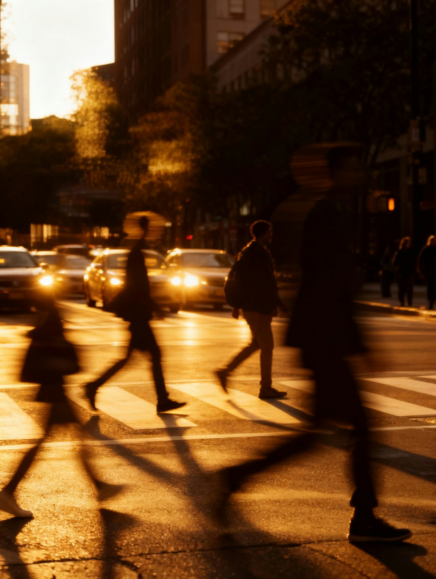 A city street at sunset with blurred silhouettes of pedestrians crossing and warm golden light casting long shadows.