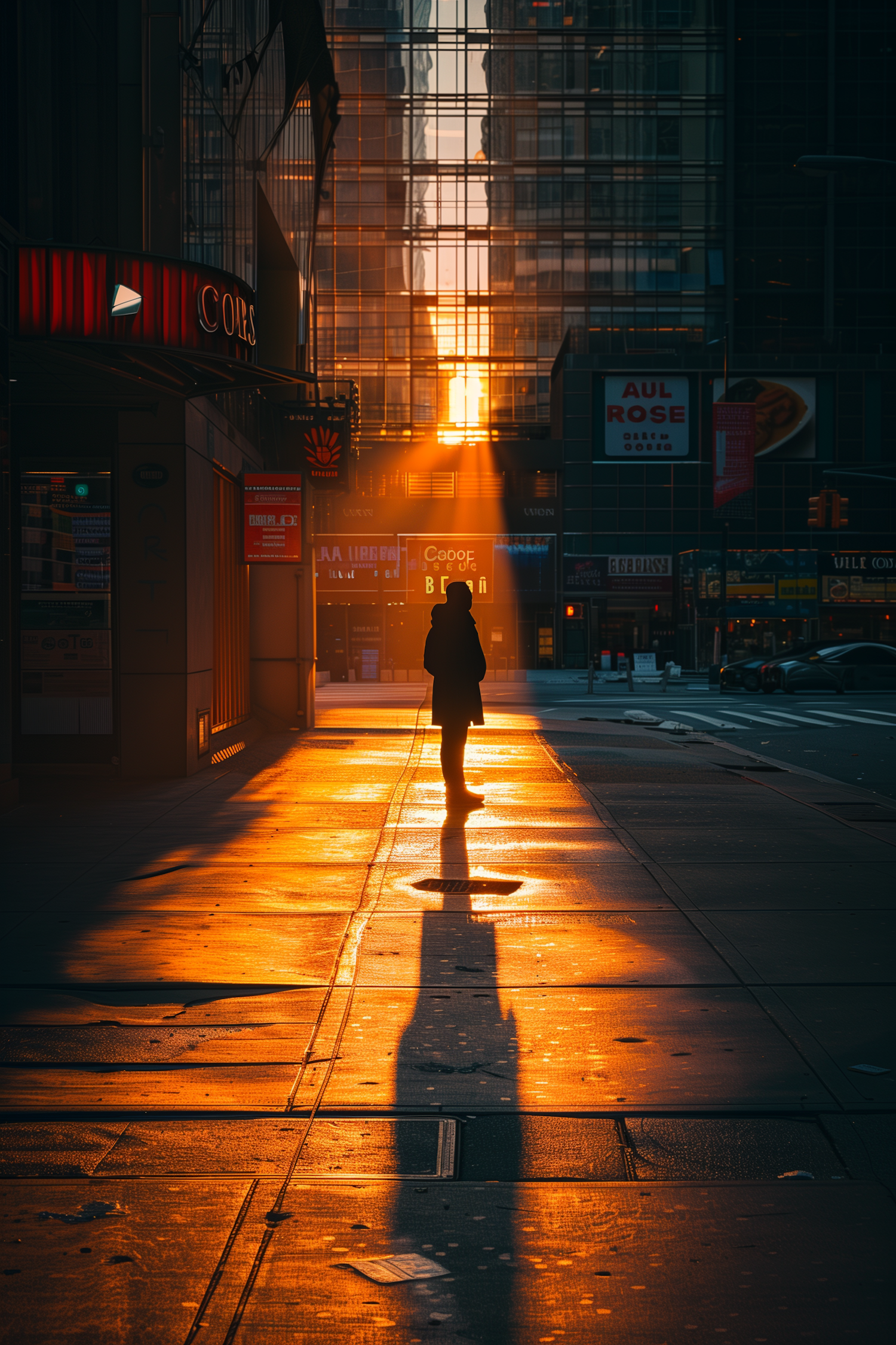 Silhouetted figure on a city street at sunset, with golden light and long shadows creating a dramatic urban scene.