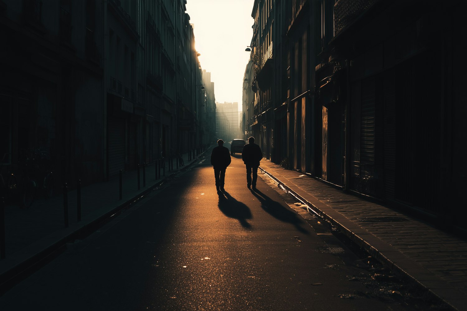 Two silhouetted figures walk down a quiet urban street at sunset, with golden light casting long shadows on the wet pavement.