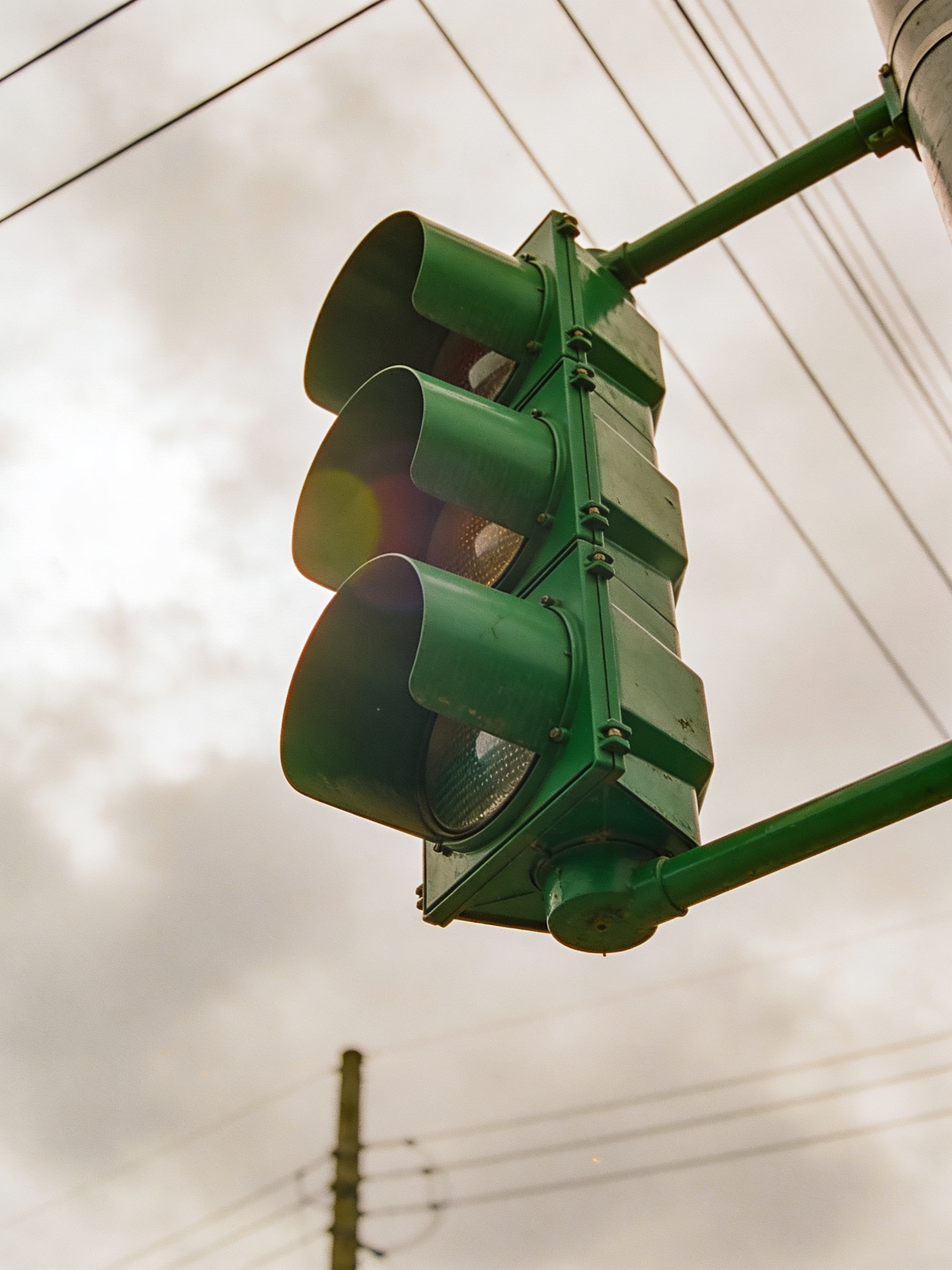 Cinematic street photography, minimalist urban detail, muted palette with green accent, soft cloudy daylight, gentle film grain, subtle halation, shallow depth of field, 85mm lens look. Upward angle shot of a green-painted traffic light housing against a pale sky, cables and poles softly blurred, graphic composition. No readable text, no logos, no brand names.