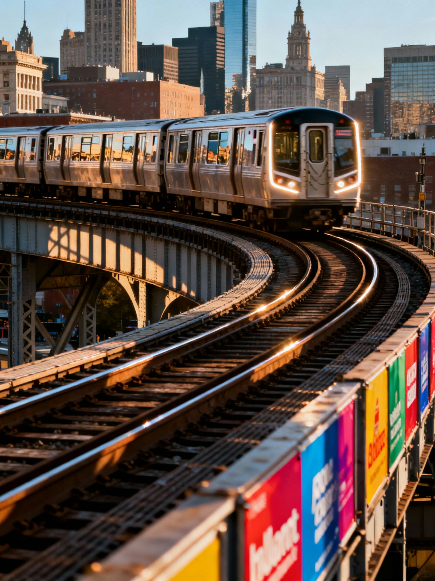 City viaduct sweeping in an S-curve with a train catching rim light; glinting rails and saturated signage. 24–28 mm, f/7.1, ISO 200, 1/320 s; WB 6000 K; pan slightly to keep the train sharp; no motion blur plug-ins. Negative: CGI glow, over-saturation, smeared noise.
