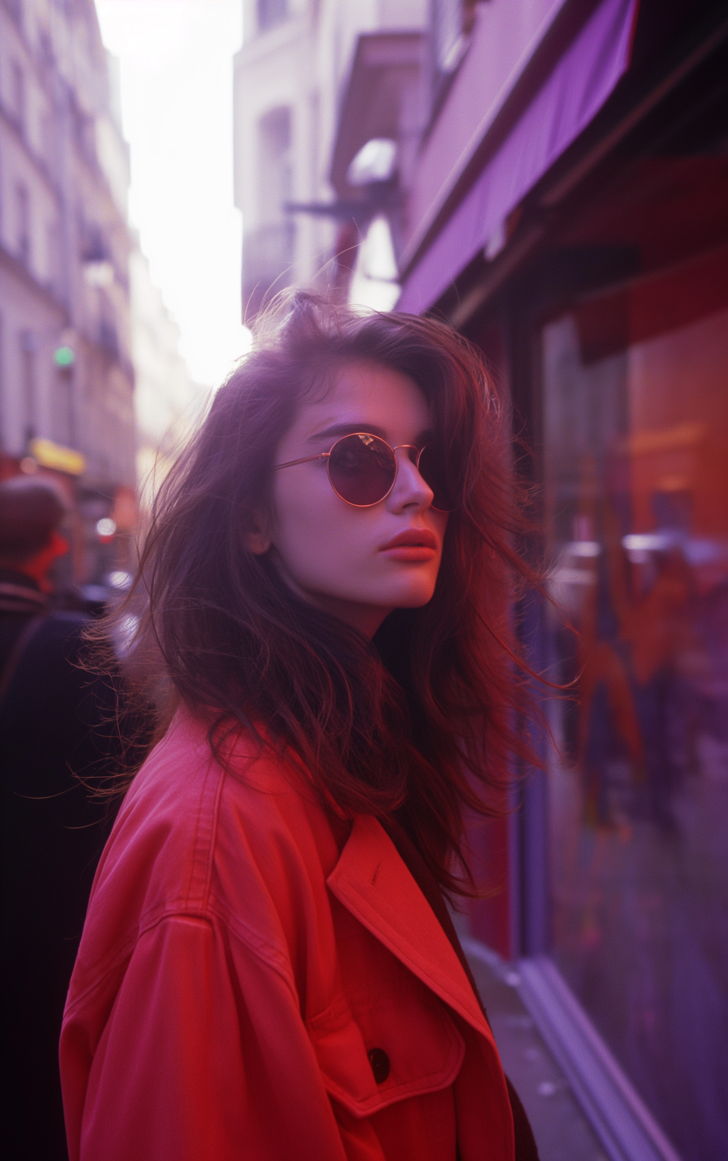 Stylish woman in red coat and sunglasses on a city street with a dreamy, pinkish hue.
