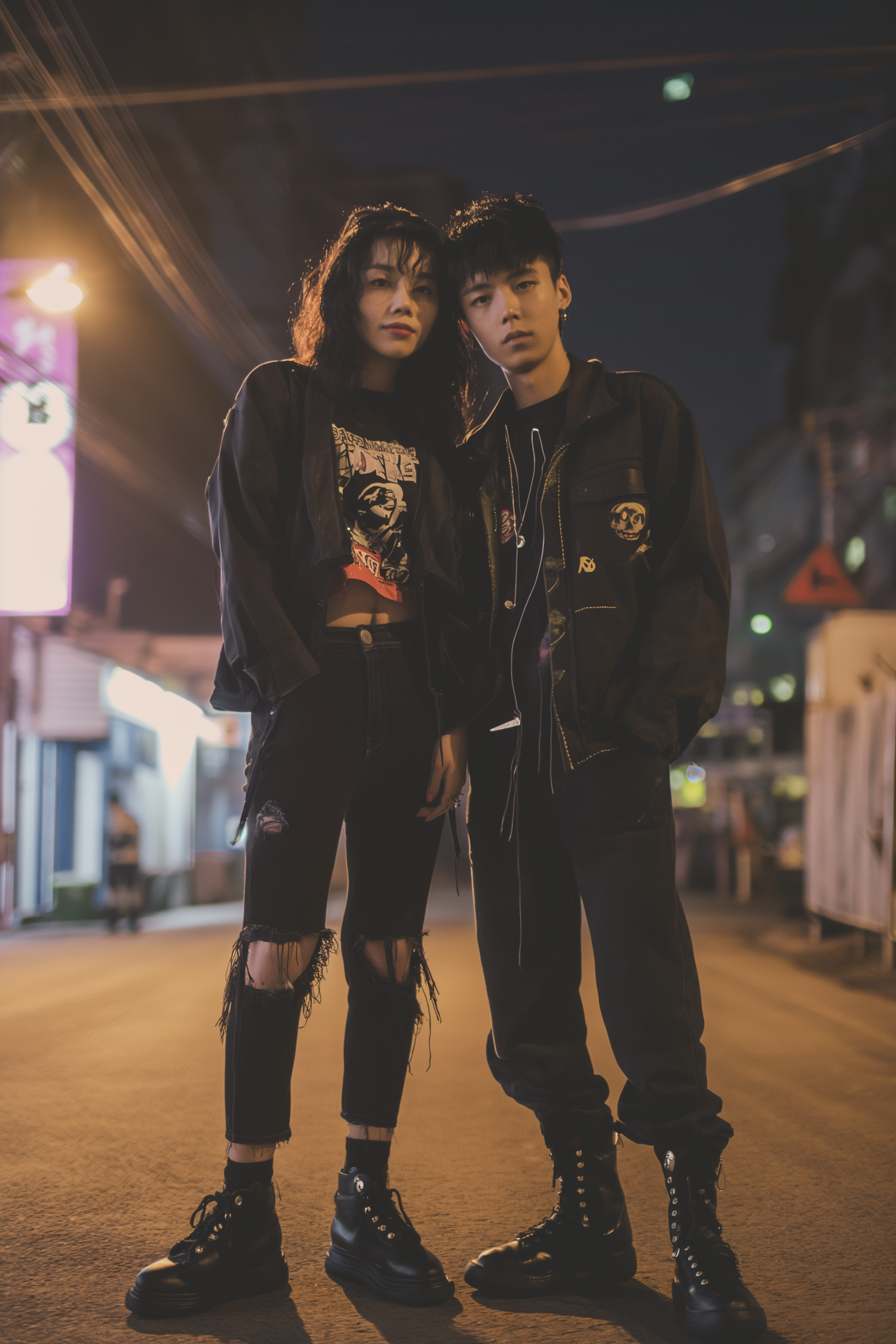 Two young individuals in punk style outfits stand on a dimly lit street at night, exuding a cool, urban vibe.