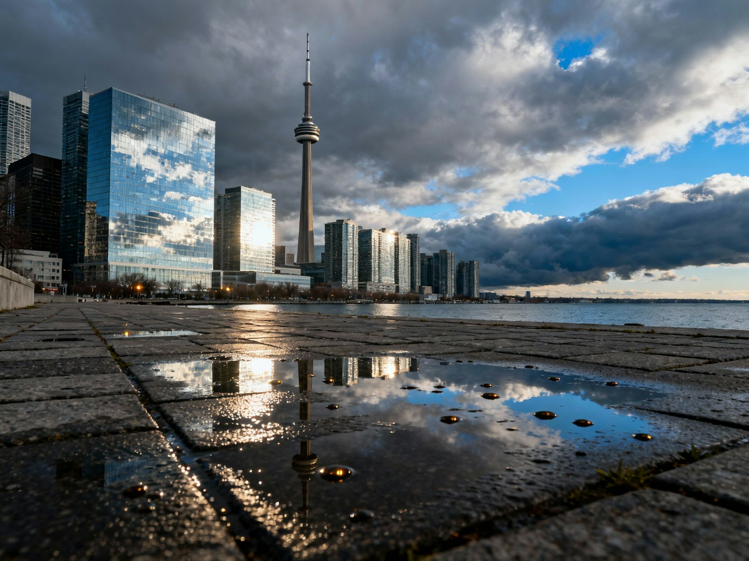 Toronto, Canada — CN Tower and skyline viewed from Harbourfront after sleet; late-afternoon raking sun from camera-left (~35°); neutral-cool 5200–5400 K; wet promenade stones with small puddles; clouds breaking over Lake Ontario; glass façades luminous. 24 mm, f/7.1, ISO 100, 1/250 s; circular polarizer to deepen sky and manage window reflections—rotate gently to avoid rainbow banding. Negative: golden hue, HDR crunch, halo edges, mirror water, over-clarity.