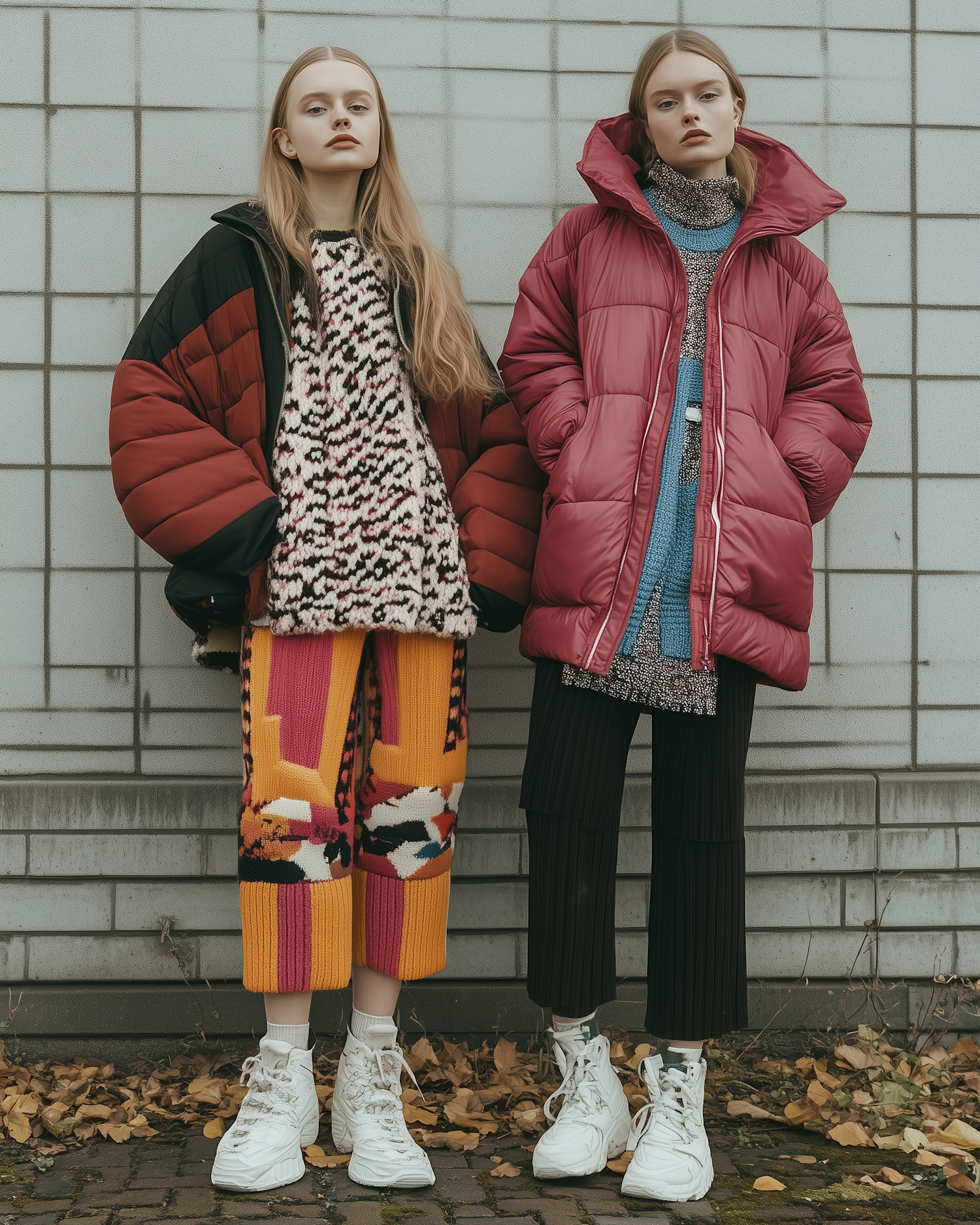 Two women in stylish winter outfits with puffer jackets and colorful knitwear, standing against a tiled wall with fallen leaves.