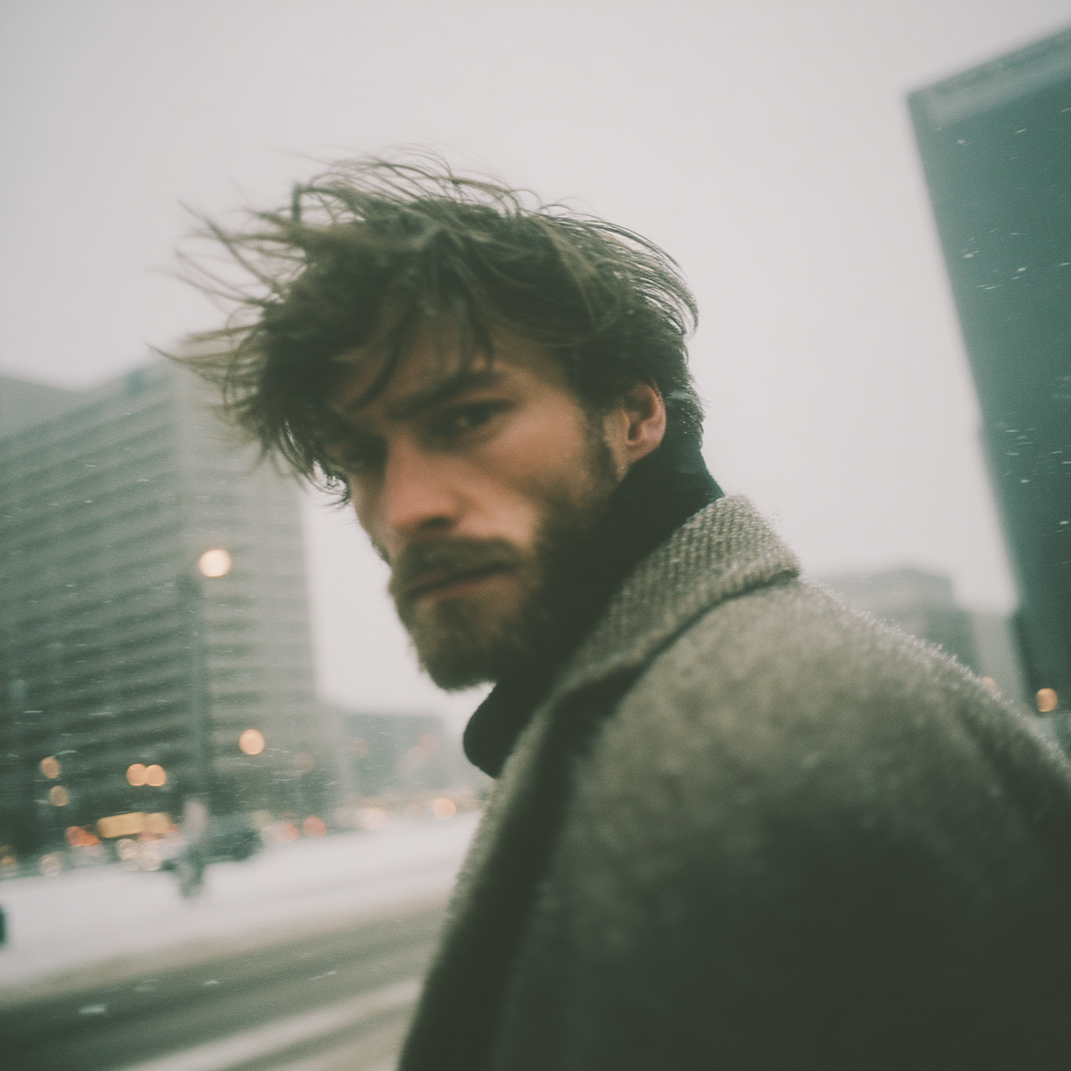 A man with a beard and tousled hair in a textured coat stands in a snowy urban setting, with blurred city buildings in the background.
