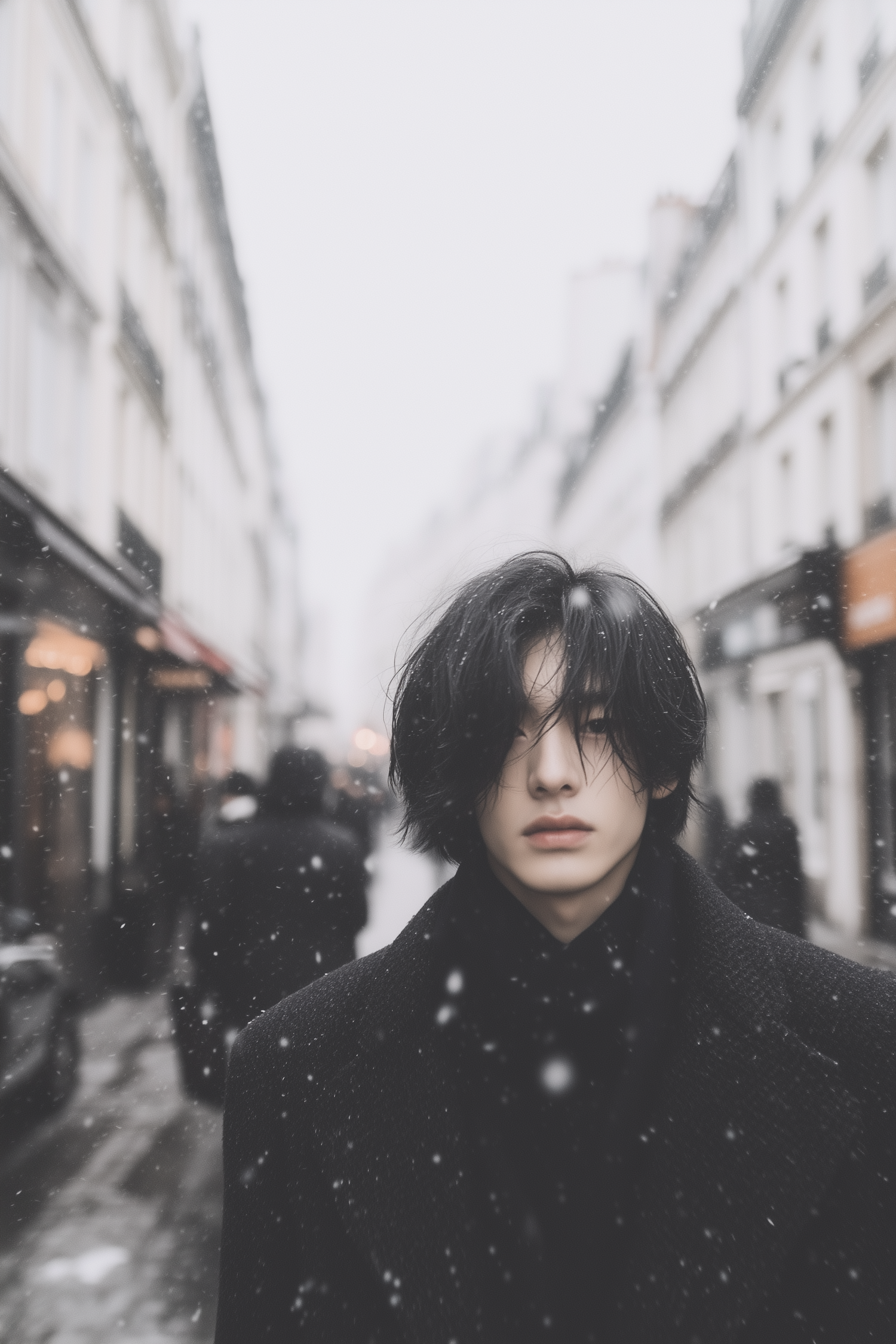 Young man with long black hair in a snowy city street, wearing a dark coat. Snowflakes fall around him, creating a serene winter atmosphere.