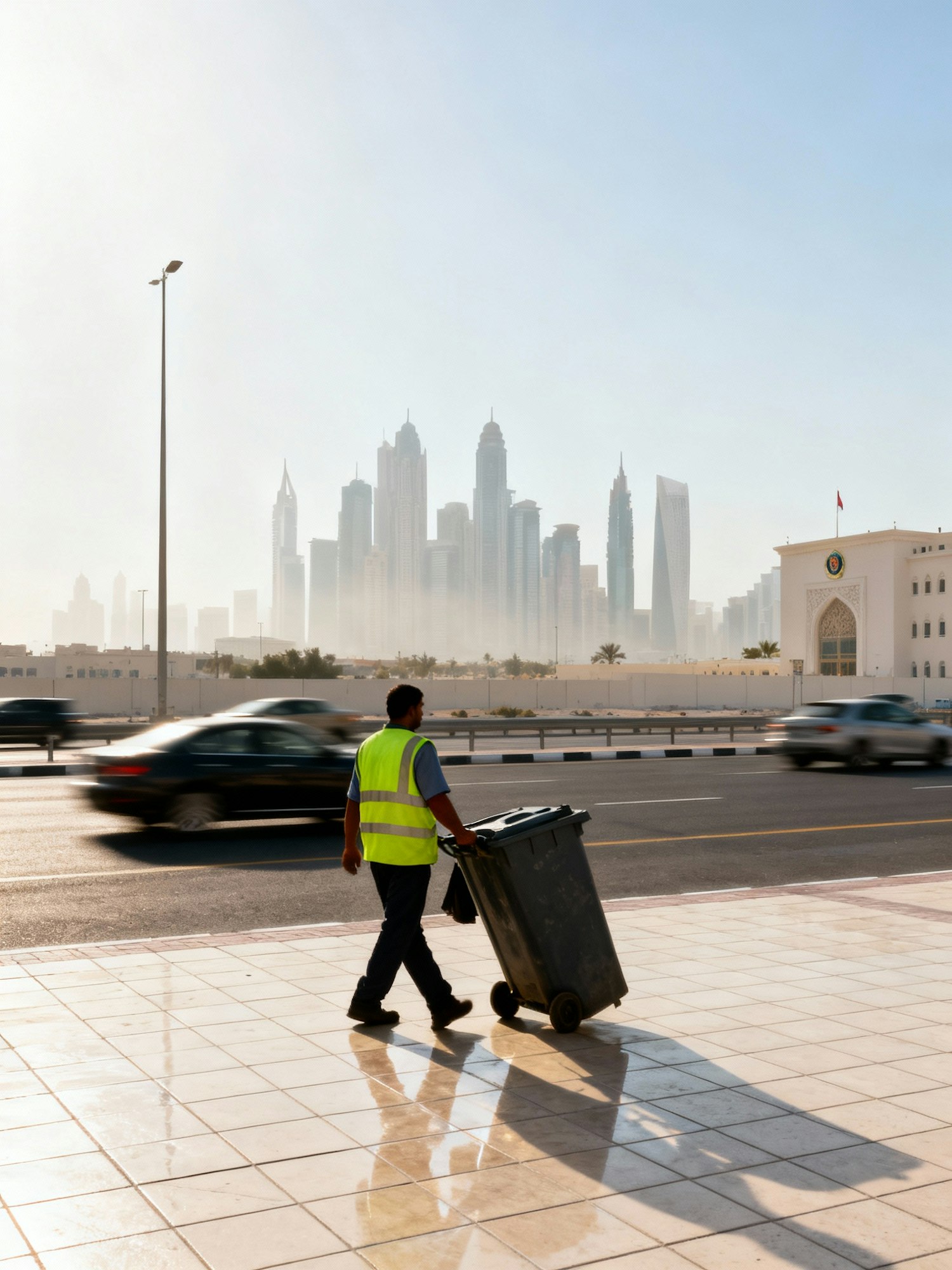 Late-morning near a wide road with Dubai skyline in background, clear sky, glass-and-steel towers softened by heat haze; street maintenance worker in high-vis vest pulling a wheeled bin across the pavement, background traffic slightly blurred; sun reflecting off light tiles and safety vest. 35 mm, 1/800 s, f/4, ISO 100, WB 5200 K; front-lit, side fill from pale building to avoid deep shadows. Negative: government/hotel logos, overpolarized sky, crunchy HDR pavement.