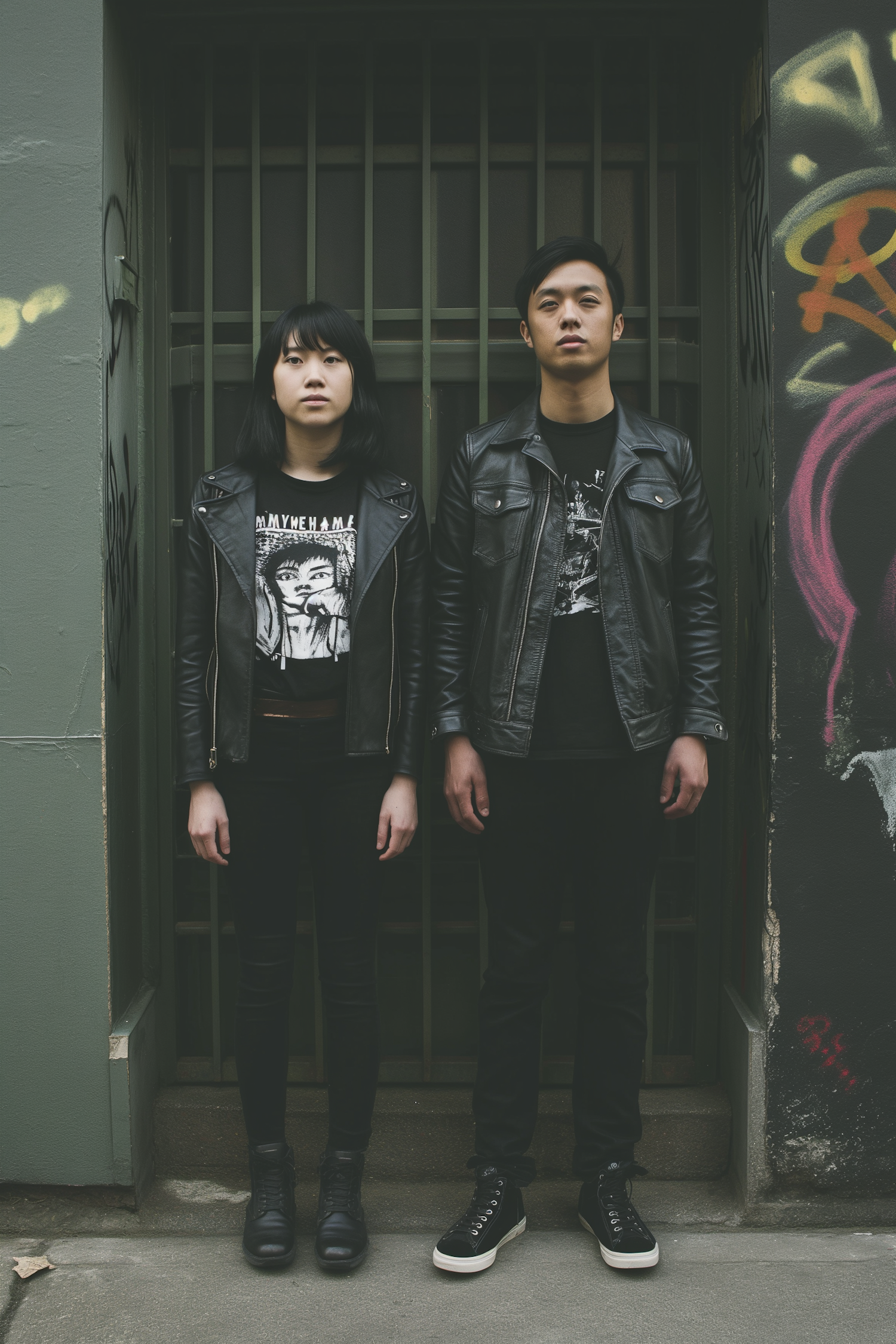 Two individuals in black leather jackets stand against a graffiti-covered wall, showcasing a punk style with neutral expressions.