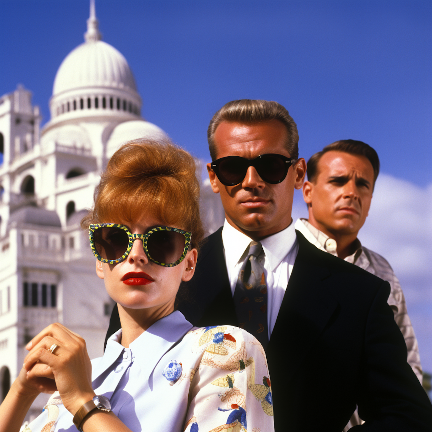 Stylish trio in sunglasses poses confidently in front of a grand domed building under a vivid blue sky.