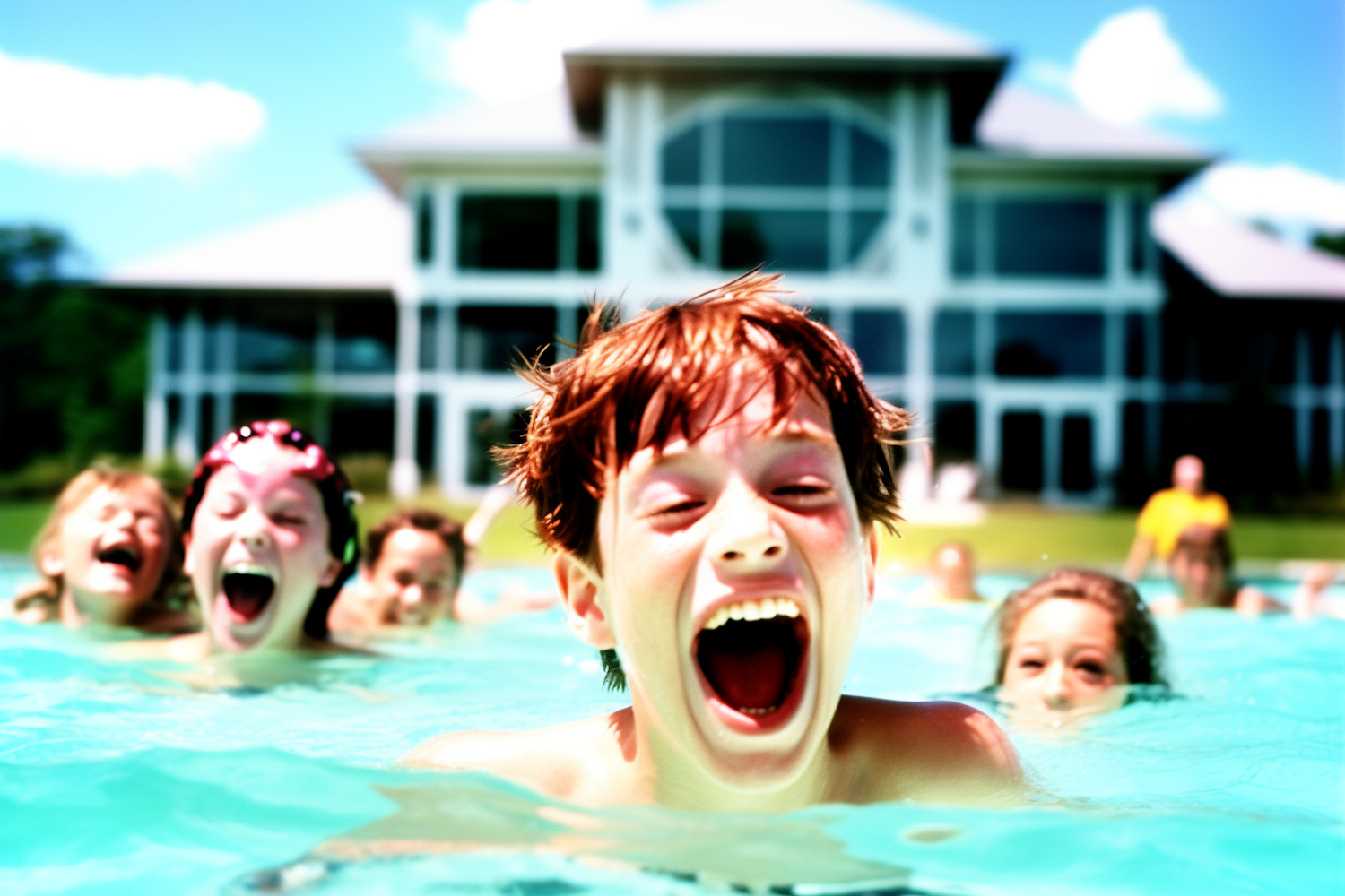 Children laughing and playing in a swimming pool on a sunny day, with a modern building in the background.