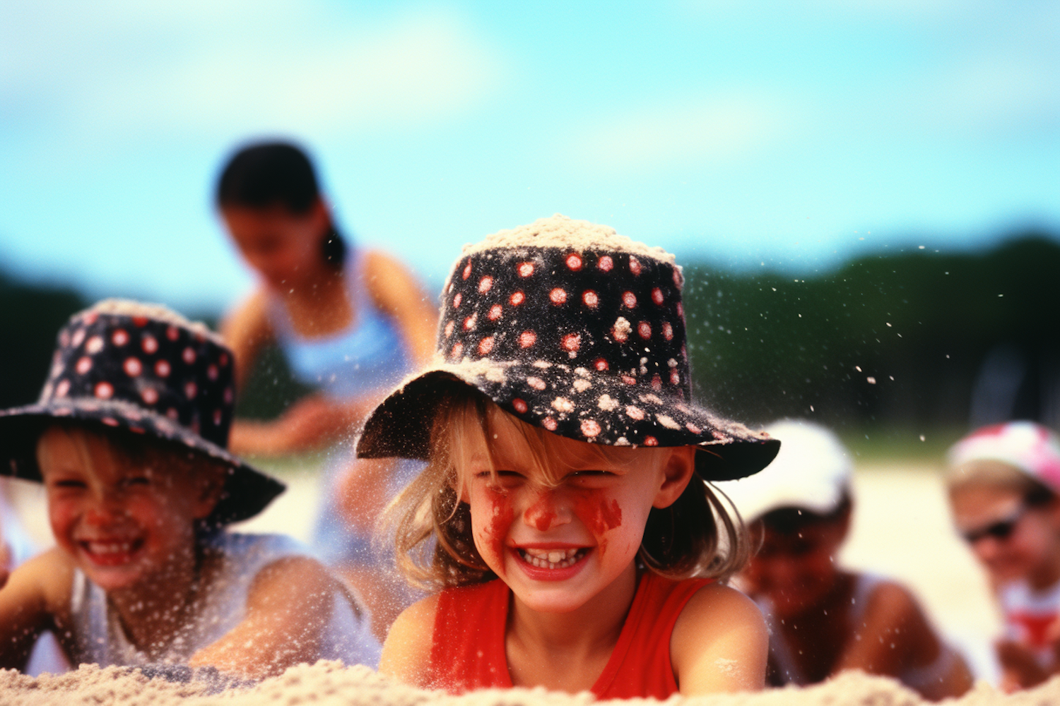 Children joyfully play on a sunny beach, wearing polka dot hats and smiling with sand-covered faces.