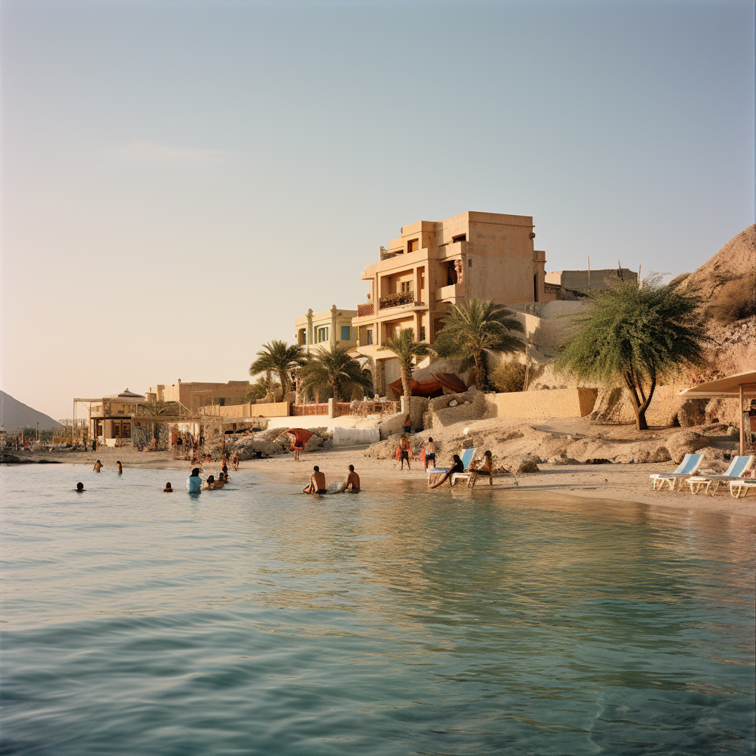 Tranquil beach scene with people enjoying the sun and sea, surrounded by Mediterranean-style buildings and palm trees.