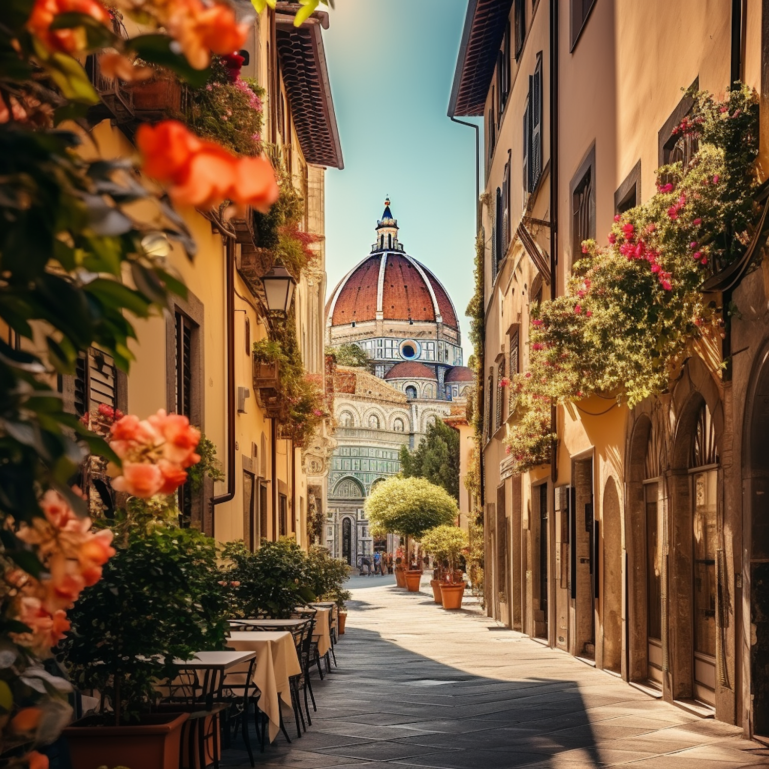 Charming Florence street with vibrant flowers and a view of the iconic Duomo dome under a clear blue sky.