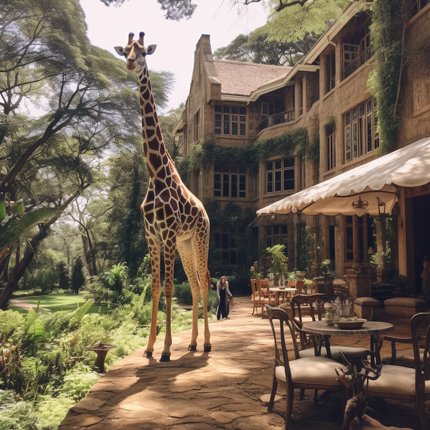 A giraffe stands on a patio near a grand building, surrounded by lush greenery and outdoor dining furniture.