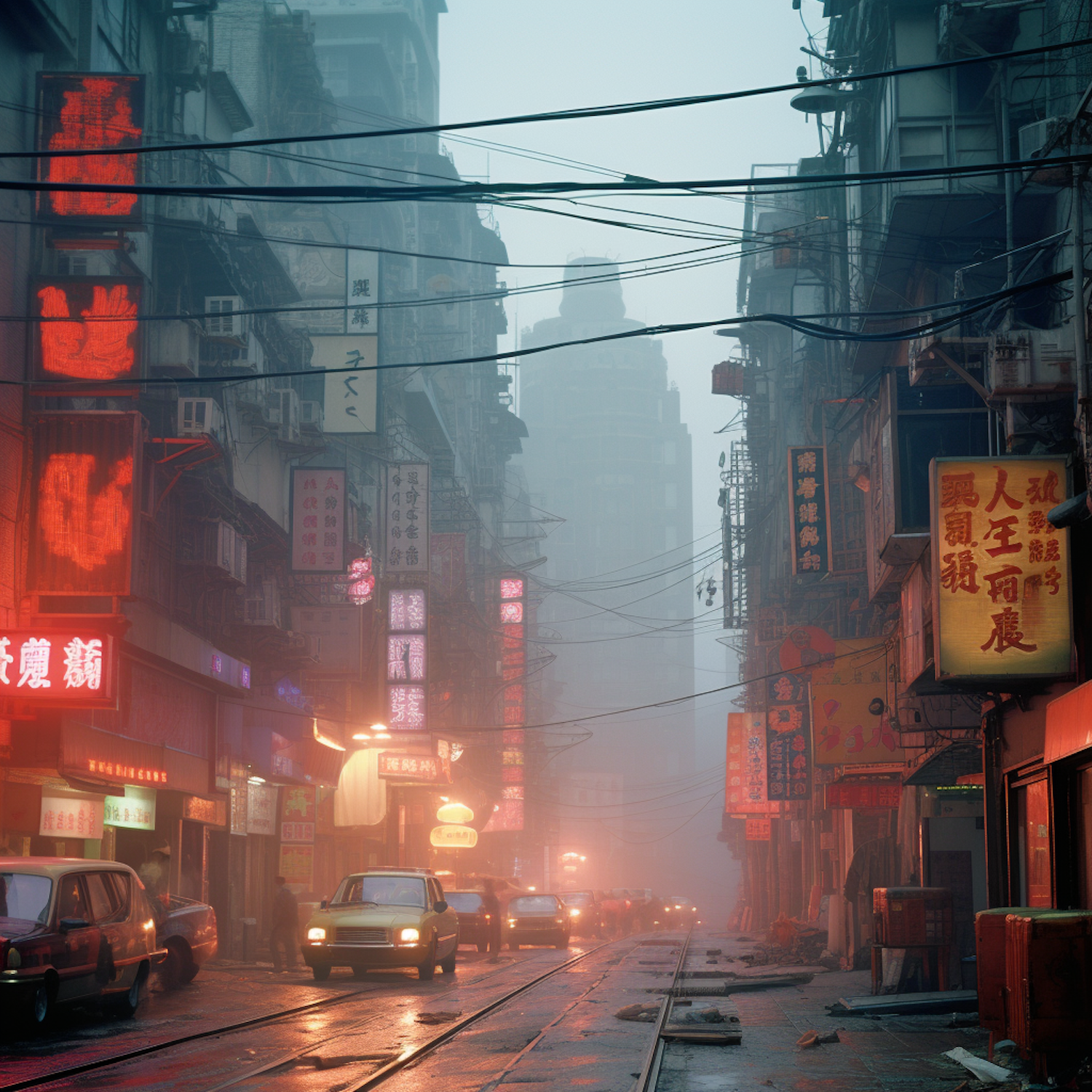 Misty urban street with glowing neon signs, cars on wet roads, and towering buildings. A vibrant, atmospheric cityscape.