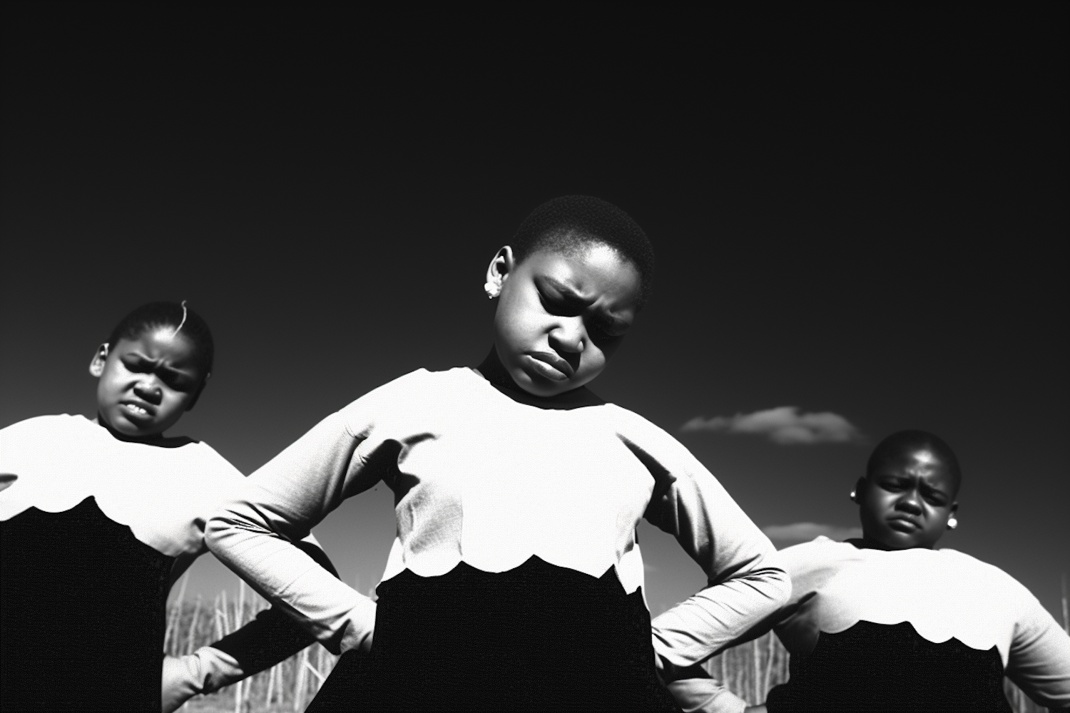 Three young girls stand confidently with hands on hips, wearing matching outfits. Black and white photo with a dramatic, timeless feel.